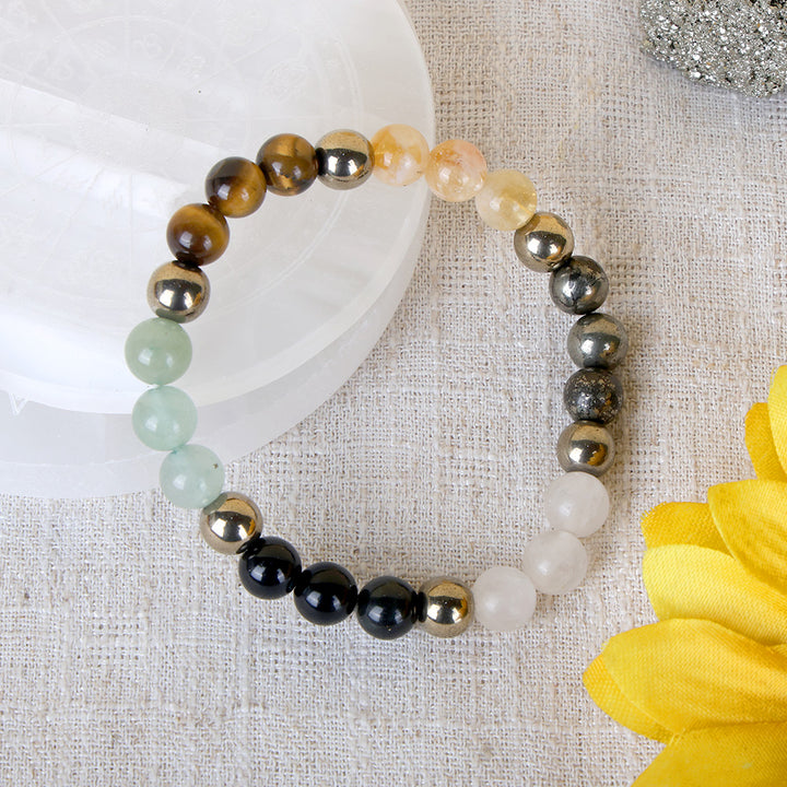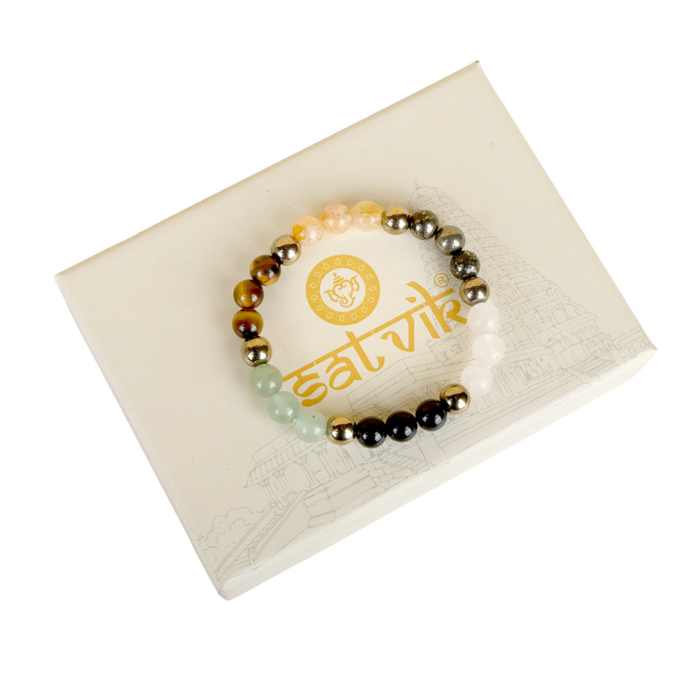 The Dhan Yog Bracelet is a powerful manifestation accessory: Tiger Eye enhances confidence and decision-making, Pyrite attracts wealth and protection, Citrine supports positivity and manifestation, Clear Quartz amplifies energy, Green Aventurine draws luck and opportunities, and Golden Pyrite strengthens abundance energy.