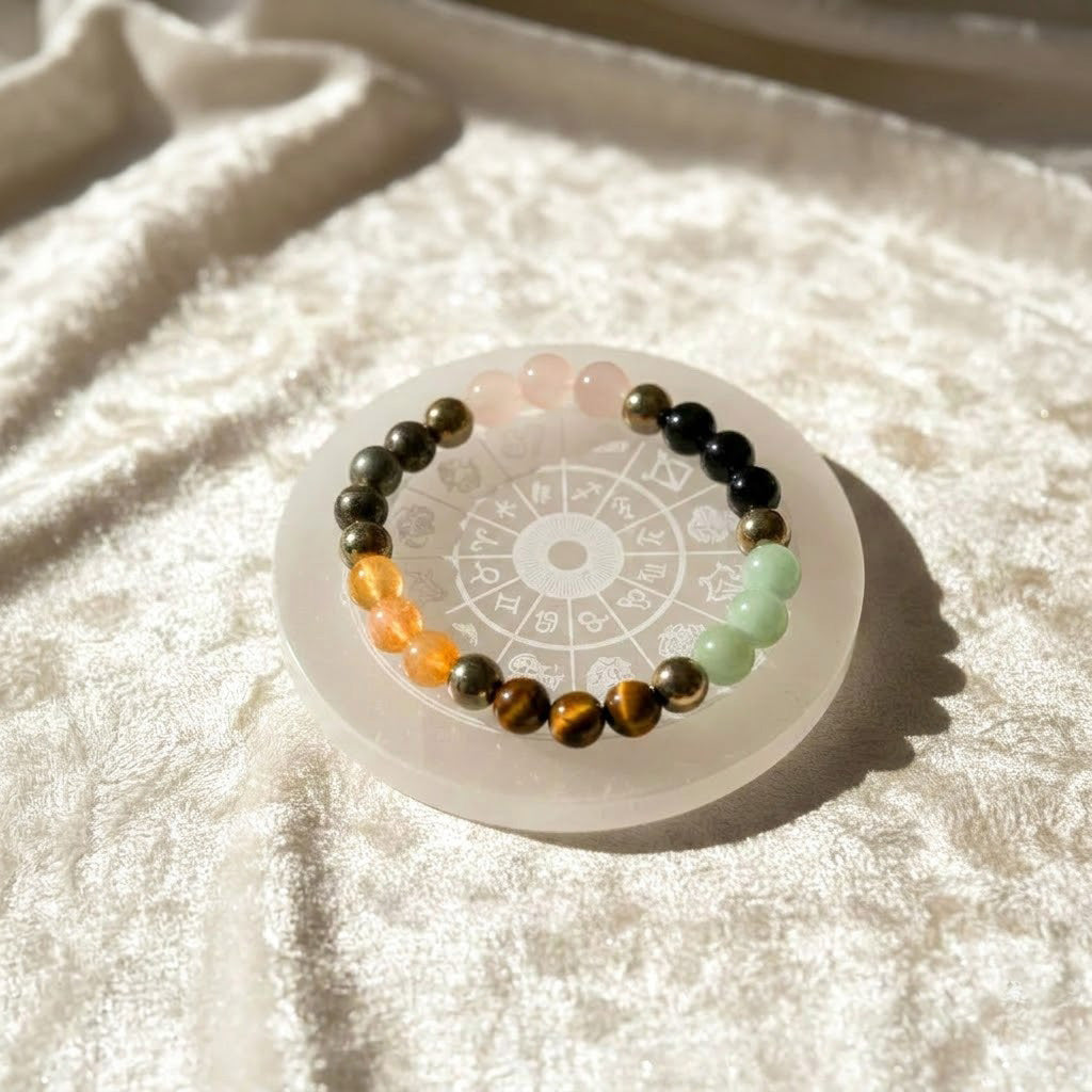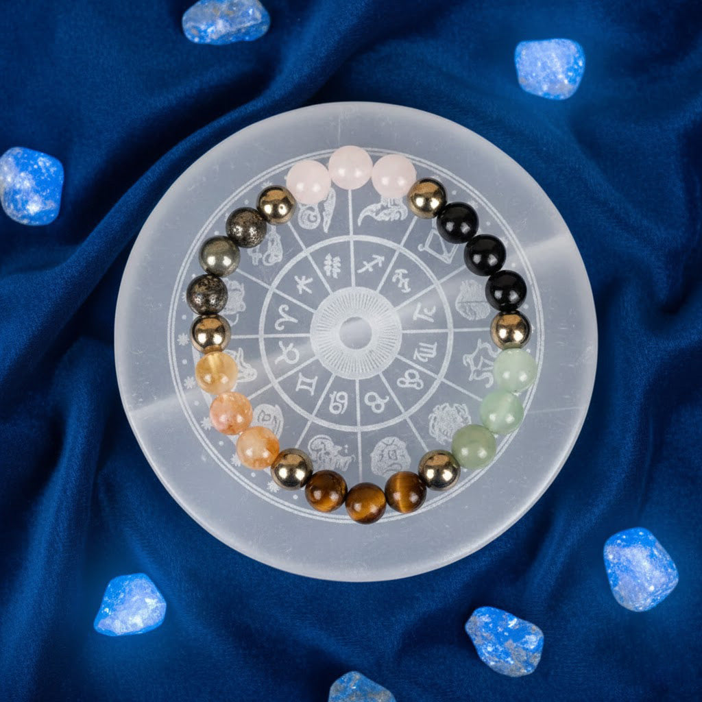 About the Product: The Wealth & Zodiac Combo is a carefully curated spiritual and healing set designed to attract prosperity, protection, positive energy, and cosmic balance. This combo includes a Dhan Yog Bracelet crafted from Tiger Eye, Pyrite, Citrine, Clear Quartz, Green Aventurine, and Golden Pyrite, paired with a Selenite Zodiac Sign Plate to align your personal cosmic energy.