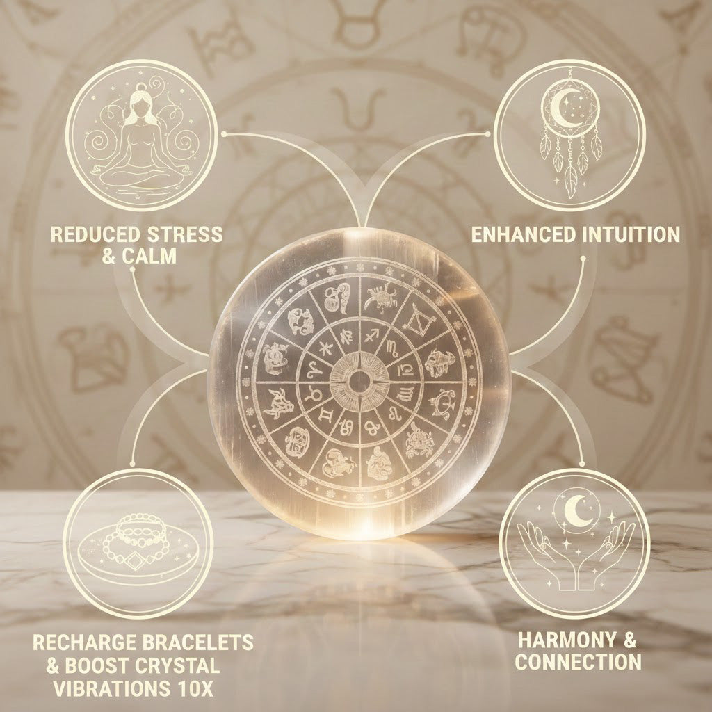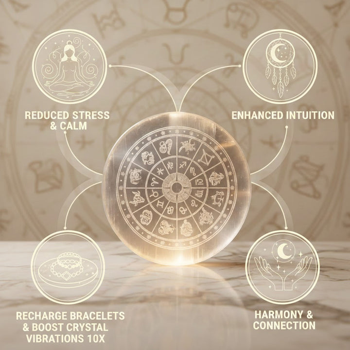 The Selenite Zodiac Sign Plate is believed to harmonize planetary energies, enhance positivity, and remove blockages in your life according to your zodiac sign. Together, this combo supports financial growth, spiritual balance, and cosmic alignment.