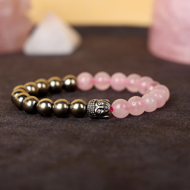 Love + Wealth Energy Balance – Rose Quartz Buddha promotes emotional harmony and love, while Golden Pyrite Bracelet attracts prosperity and abundance.