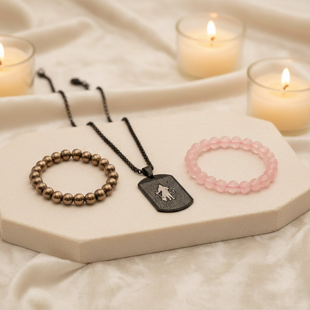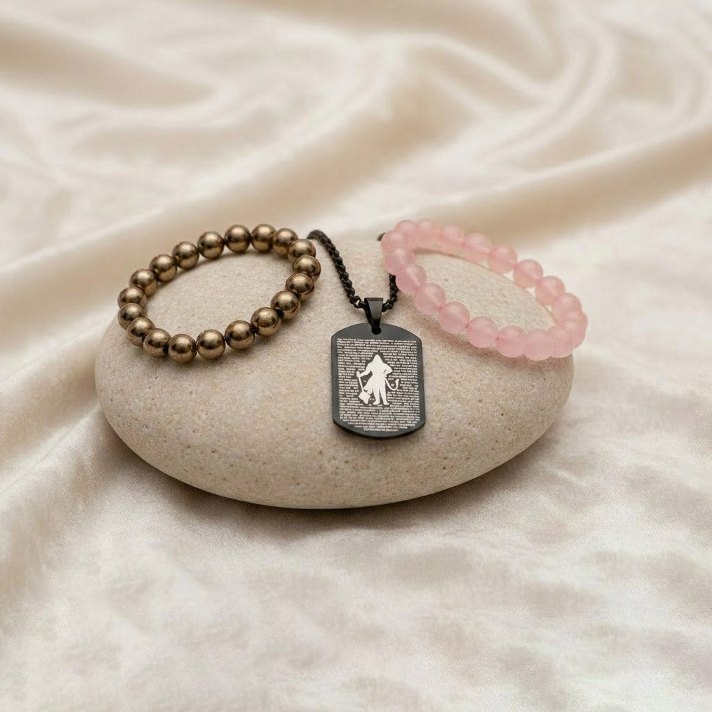 Why This Combo? (Rose Quartz + Pyrite Bracelet + Hanuman Chalisa Pendant)