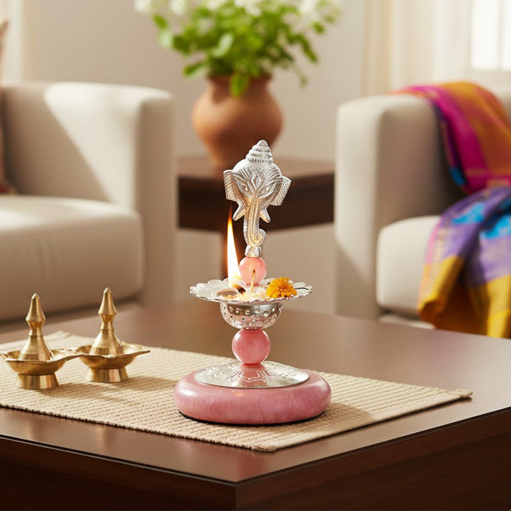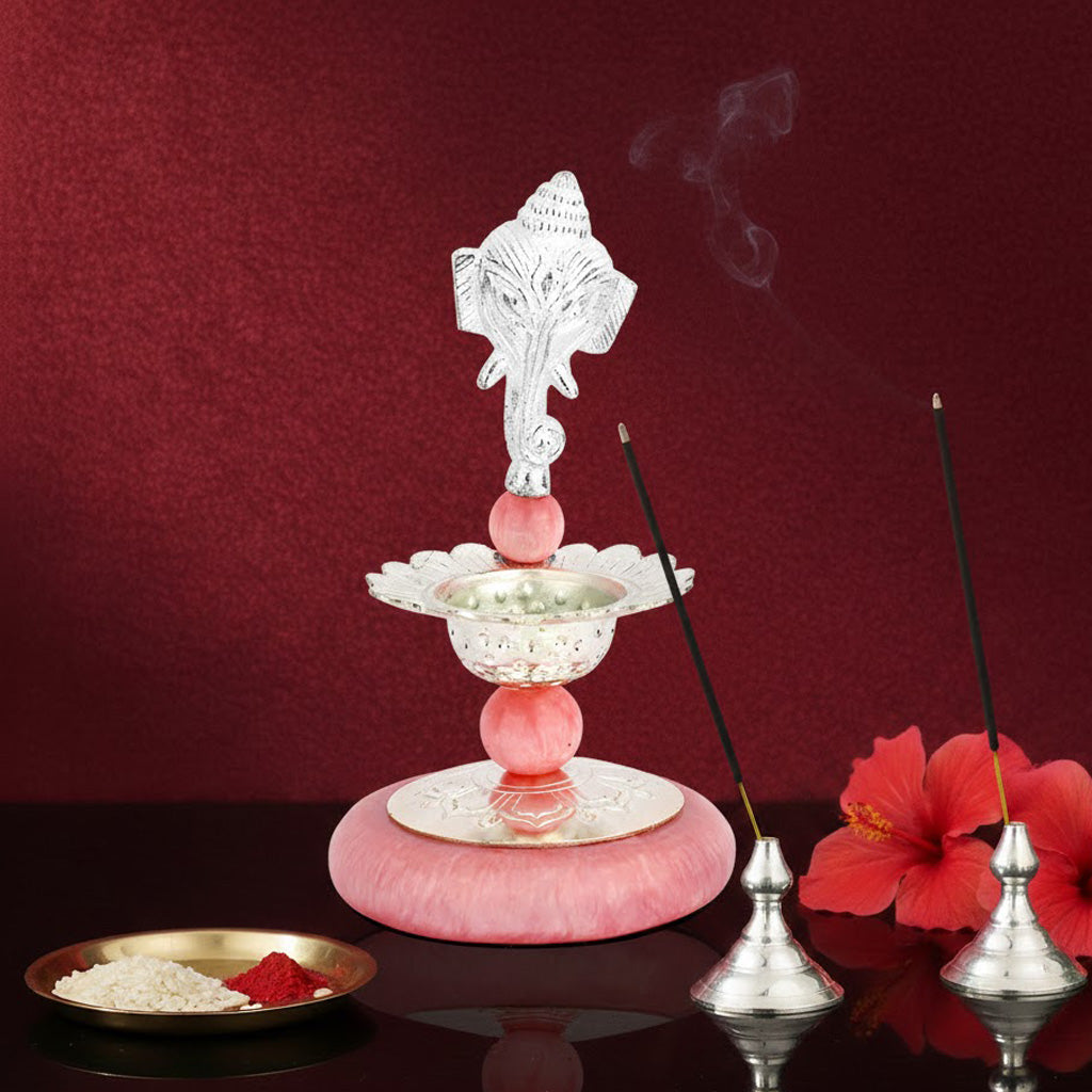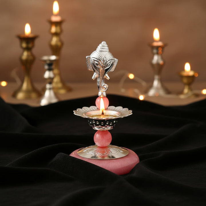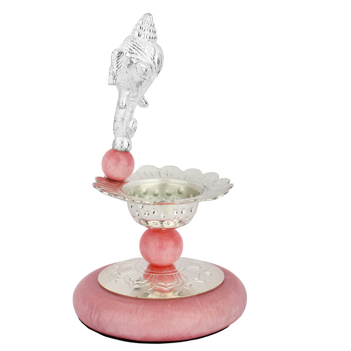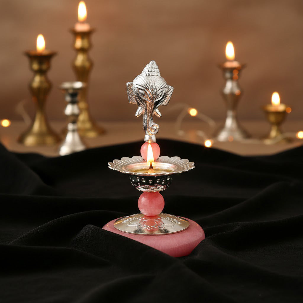 Perfect for home temples, pooja rooms, and spiritual décor, this silver-plated Ganesh deepam also makes a meaningful gifting option for weddings, housewarmings, anniversaries, and religious celebrations.