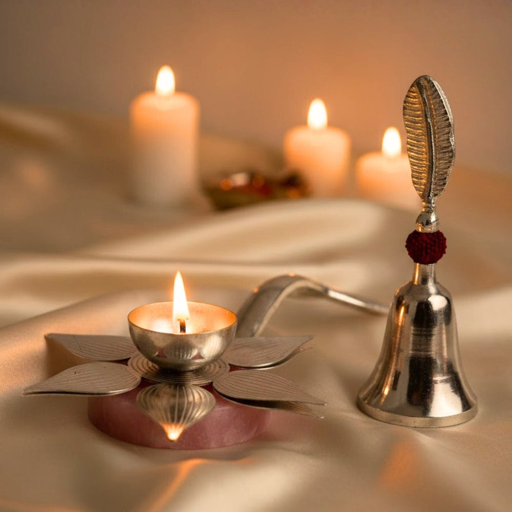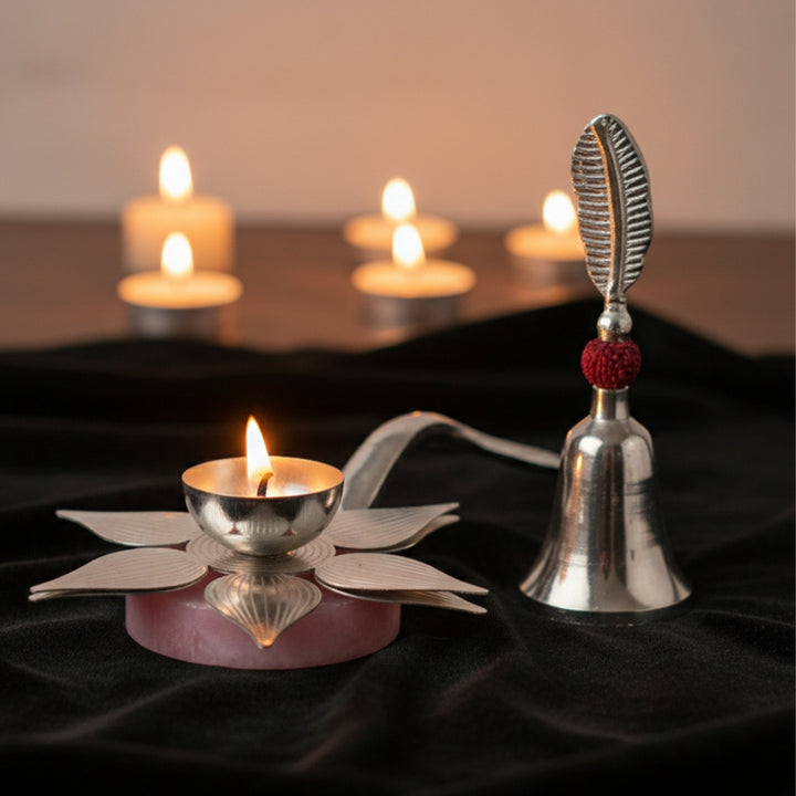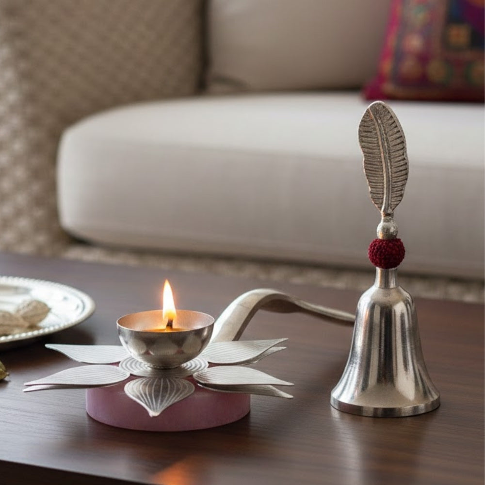 Ideal for home temples, spiritual décor, and gifting purposes, this silver lotus diya with bell makes a thoughtful present for housewarming ceremonies, weddings, and religious celebrations.