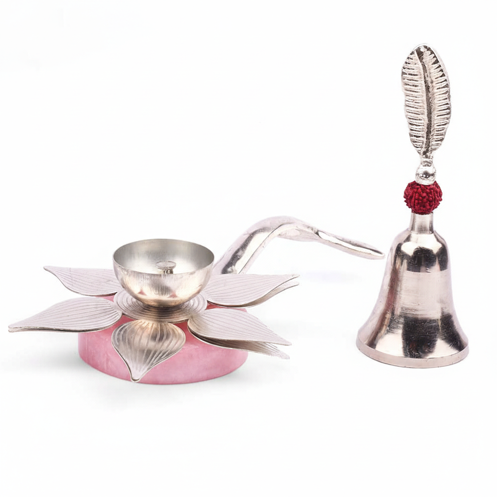 Silver Lotus Diya with Bell – Silver Plated Pooja Lamp | Satvikworld.com