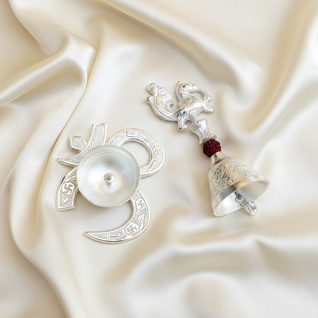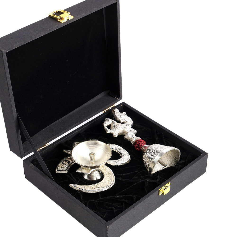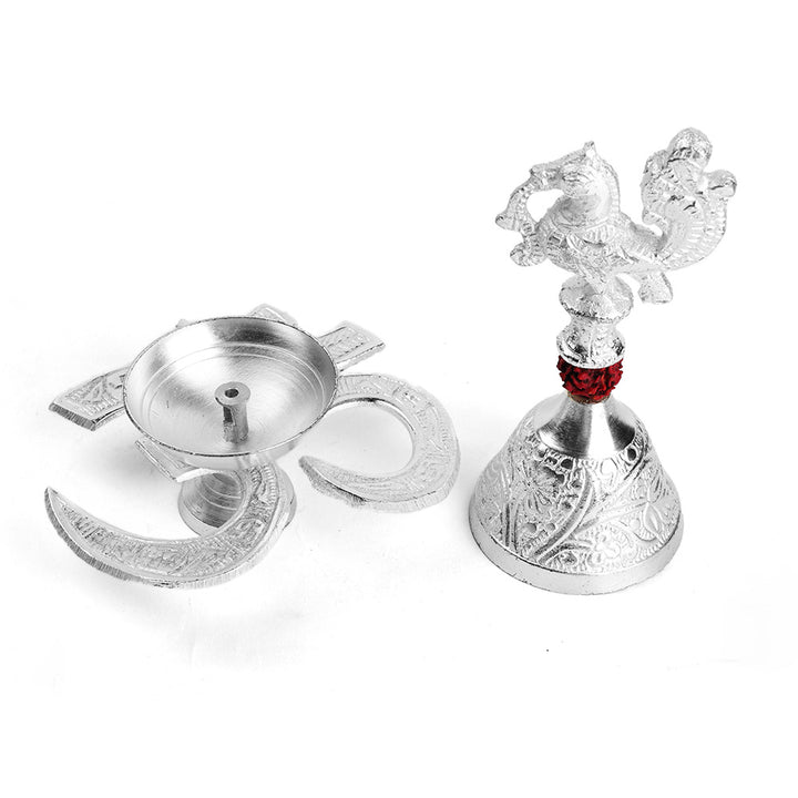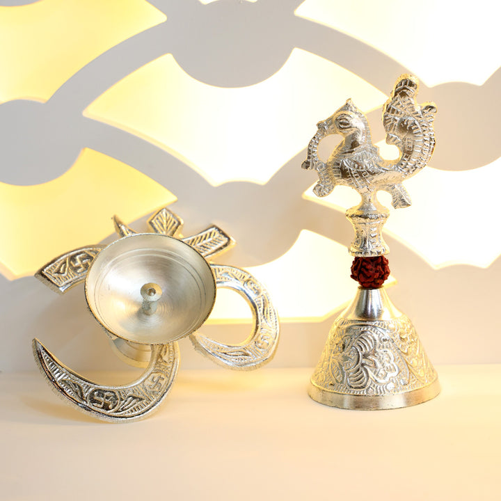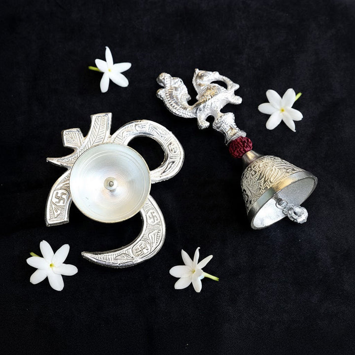 • Item Name: Silver Om Diya with Rudraksha Bell