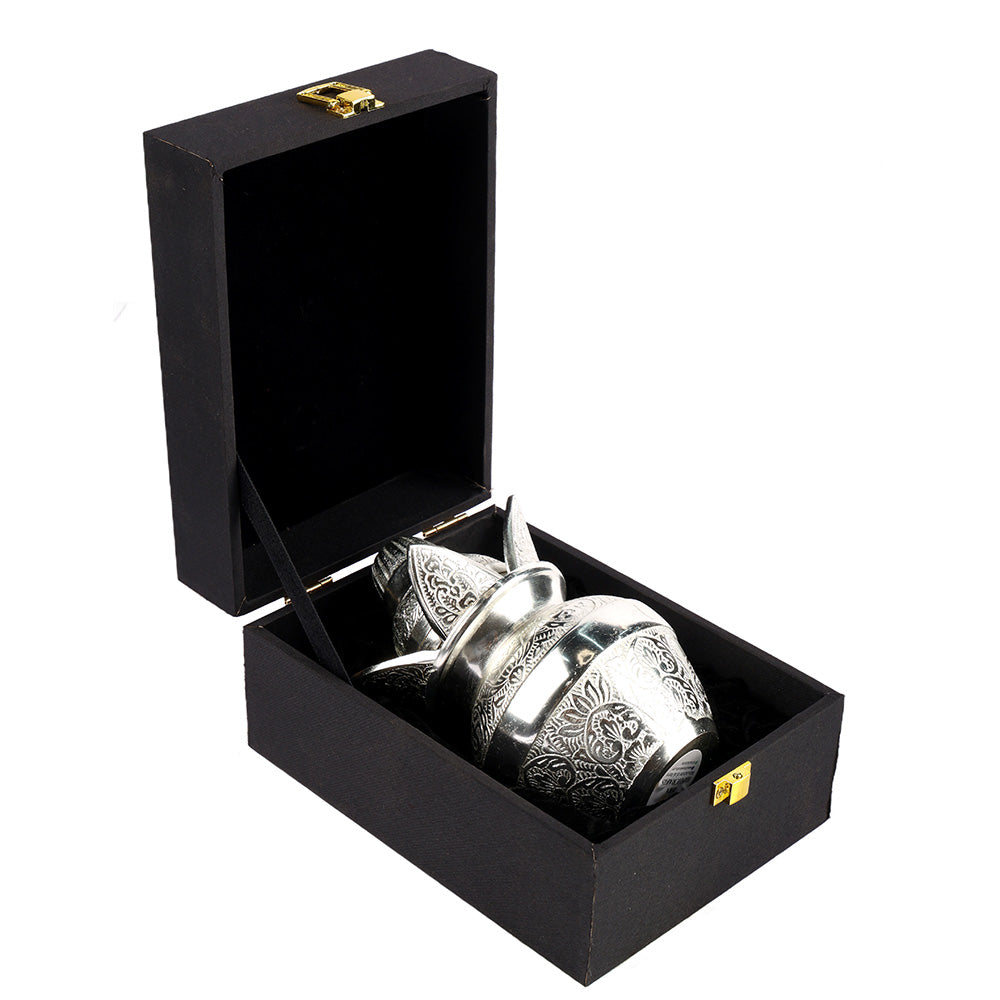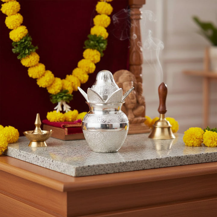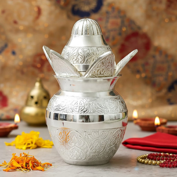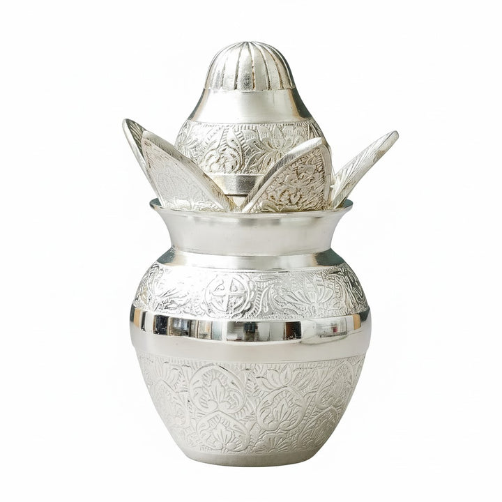 Ideal for gifting, this silver-plated kalash is perfect for weddings, housewarmings, anniversaries, and spiritual celebrations, blending functionality with timeless traditional beauty.