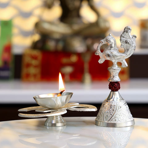 Silver Om Diya with Rudraks...