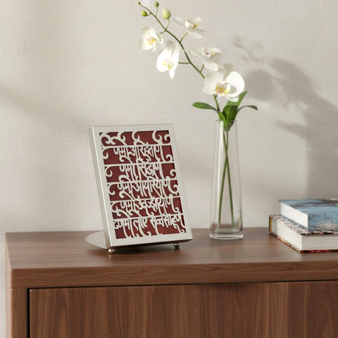 Mantra Frame with Stand Showpiece: Captivate your guests with our mantra frame showpiece. Crafted with meticulous details, this showpiece elegantly showcases auspicious mantras or spiritual verses. The accompanying stand adds a touch of refinement, making it a splendid gift for any occasion. Share positivity and serenity with this divine masterpiece.