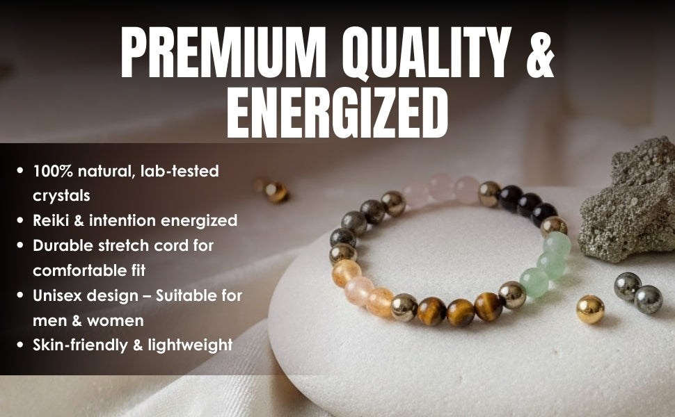 • Material: Natural Healing Stones – Citrine, Golden Pyrite, Clear Quartz, Green Aventurine, Tiger Eye, Pyrite, Black Obsidian & Rose Quartz