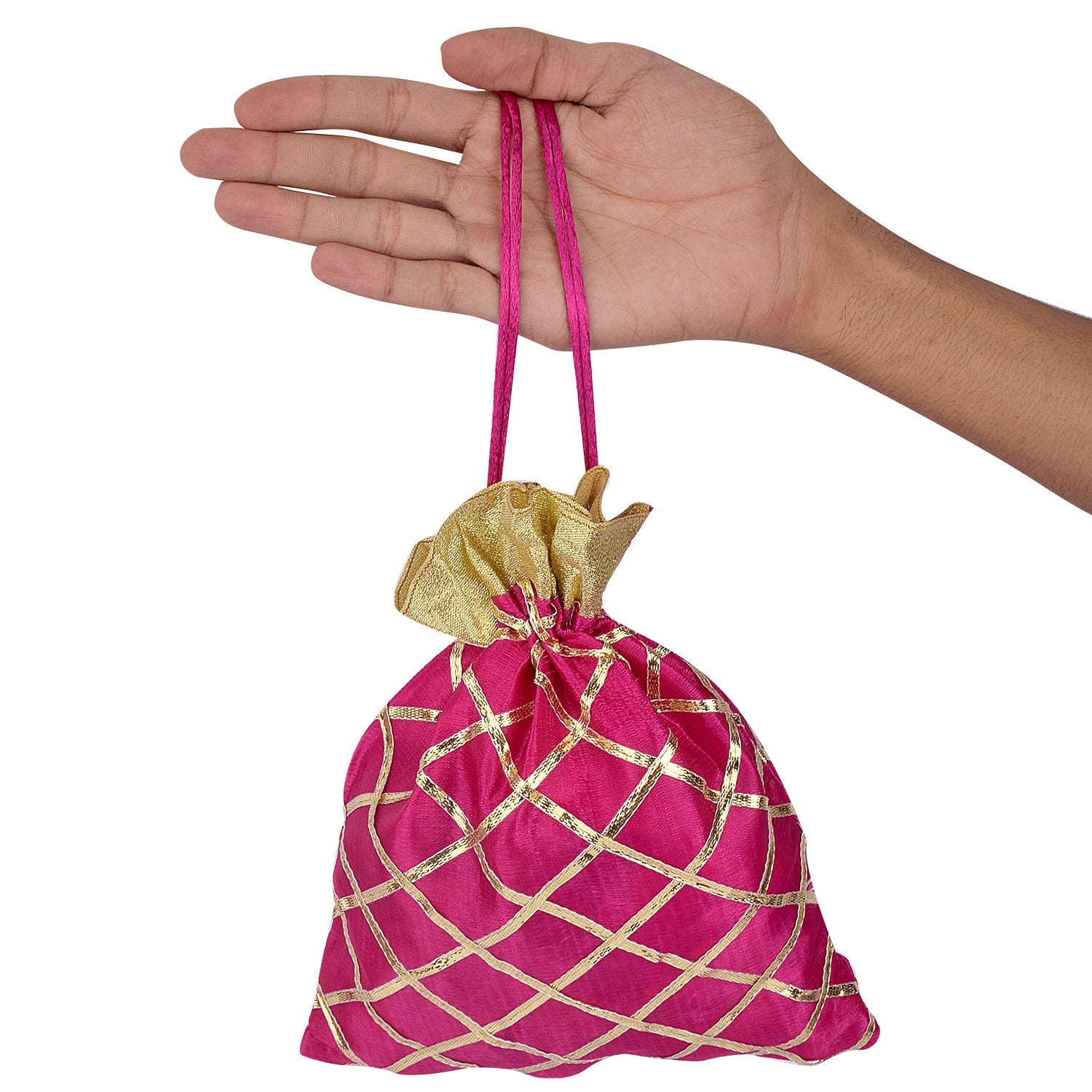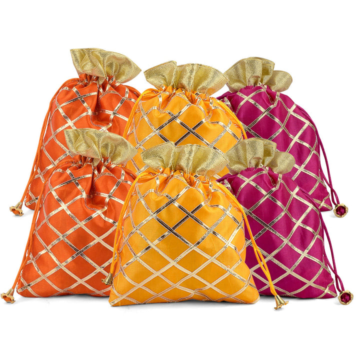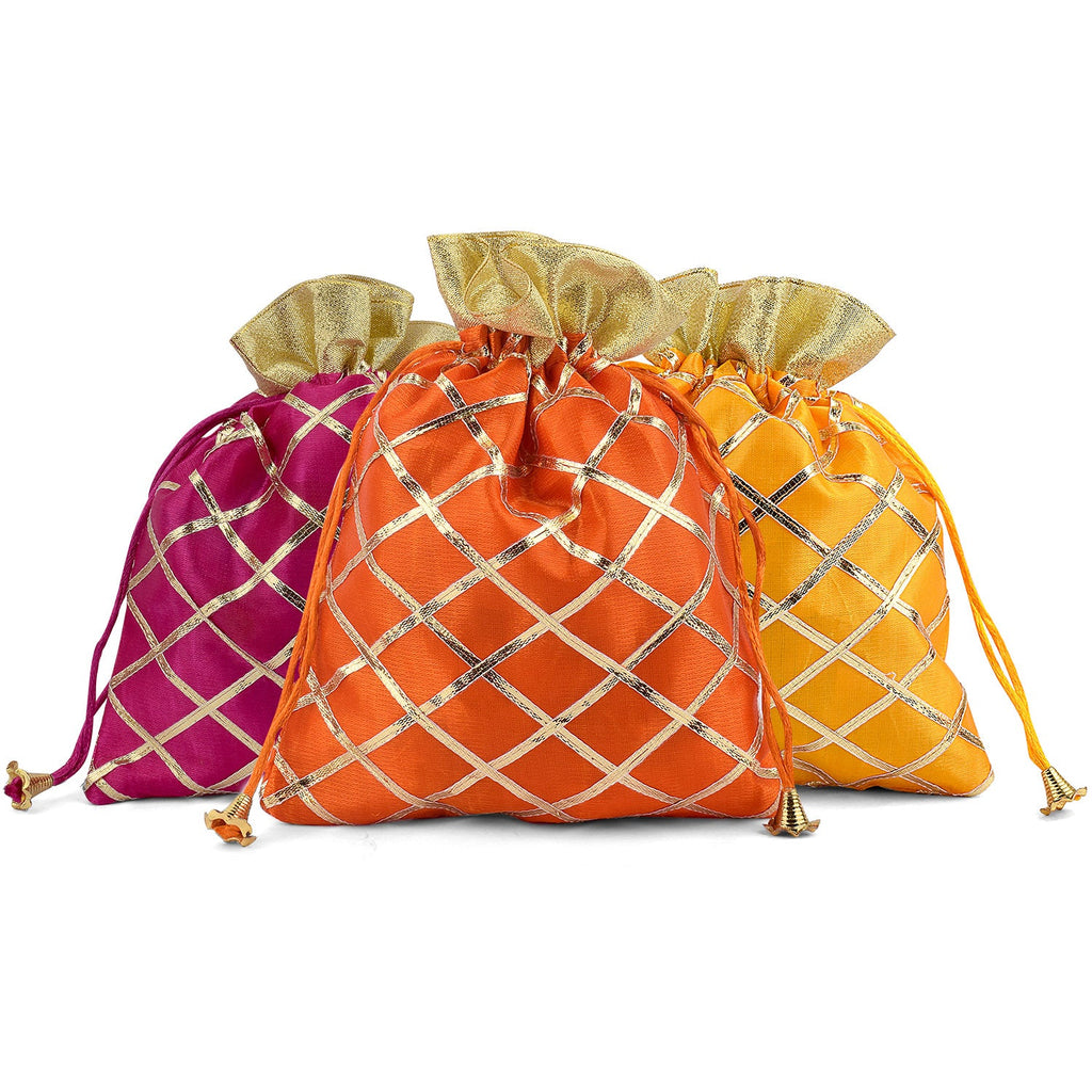 • Package Content: 4pc or 6Pc Set of Handmade Indian Potli Pouch, Ethnic Favor Bags with Golden Design All over the Pouch. Color May Vary