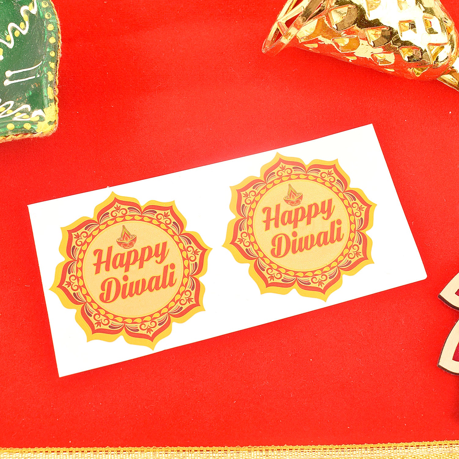 "Festive 'Happy Diwali' Sticker with Lanterns and Lights (Assorted) – Celebrate the Festival of Lights with this vibrant and joyful sticker design! Featuring the words 'Happy Diwali' surrounded by colorful lanterns, twinkling lights, and traditional festive elements, this sticker adds a warm, celebratory touch to any occasion. Perfect for decorating cards, gifts, or social media posts!"