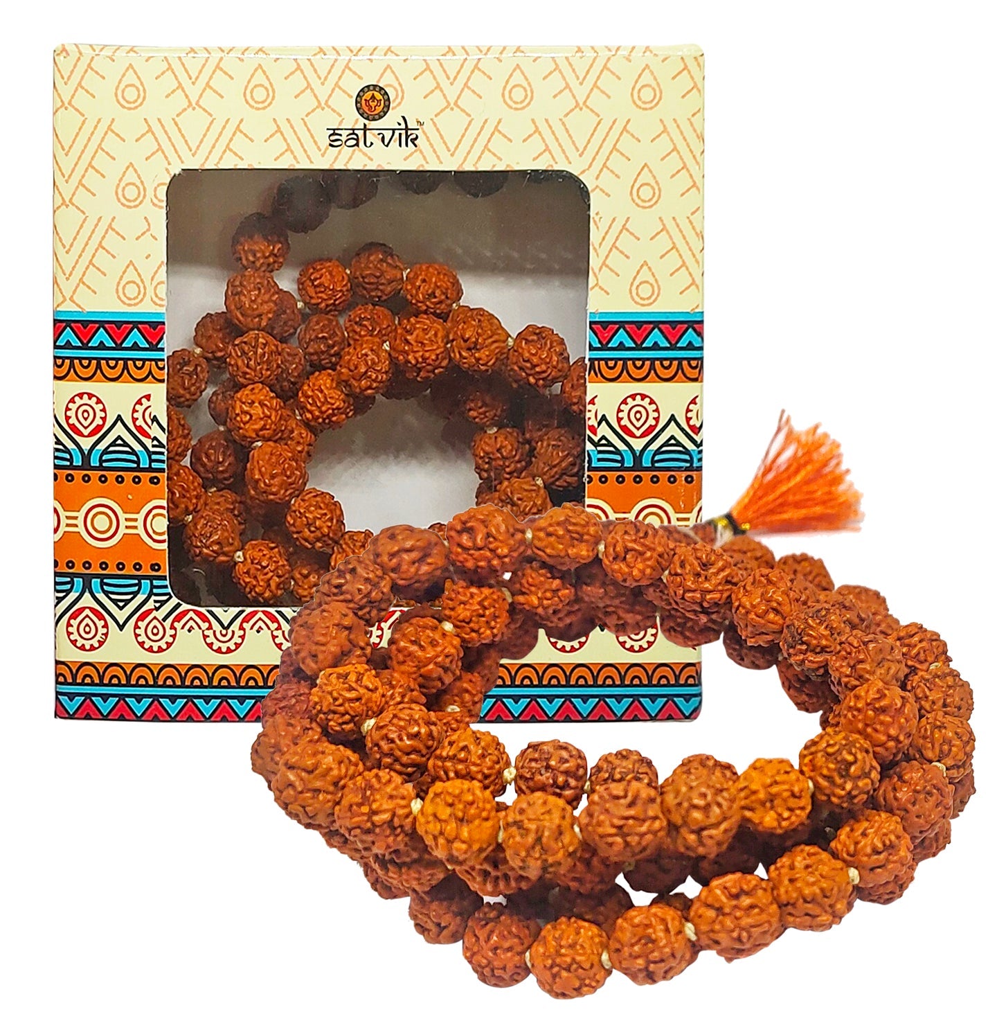 • Material : Made from High Quality Panchmukhi Rudraksha Beads to maintain the purity of Jaap Mala The beads is woven in Red Cotton Thread, A colored Fringe is also joint in the Mala.