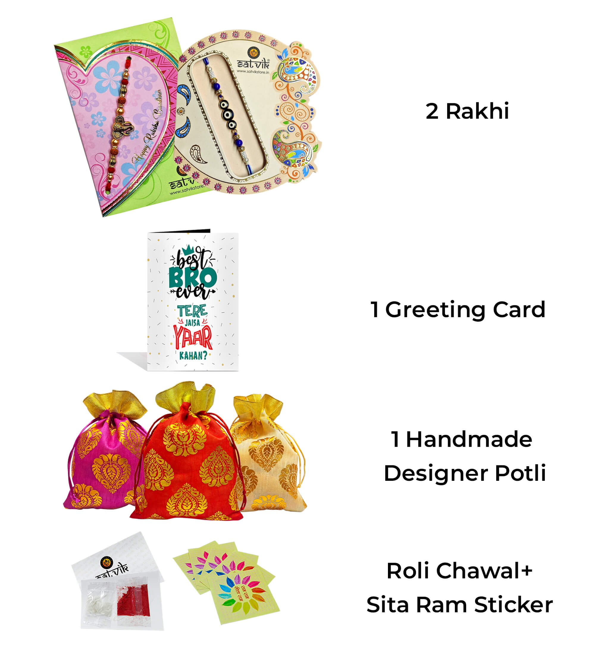 In this Box you will get  Evil Eye and Elephant Face Rakhi, Potli, Roli Chawal, Greeting Card, Holy Soun (Ram Sita Stickers). Send your Love to your brother with this Rakhi Set. It will Make Rakshabandan Memorable.