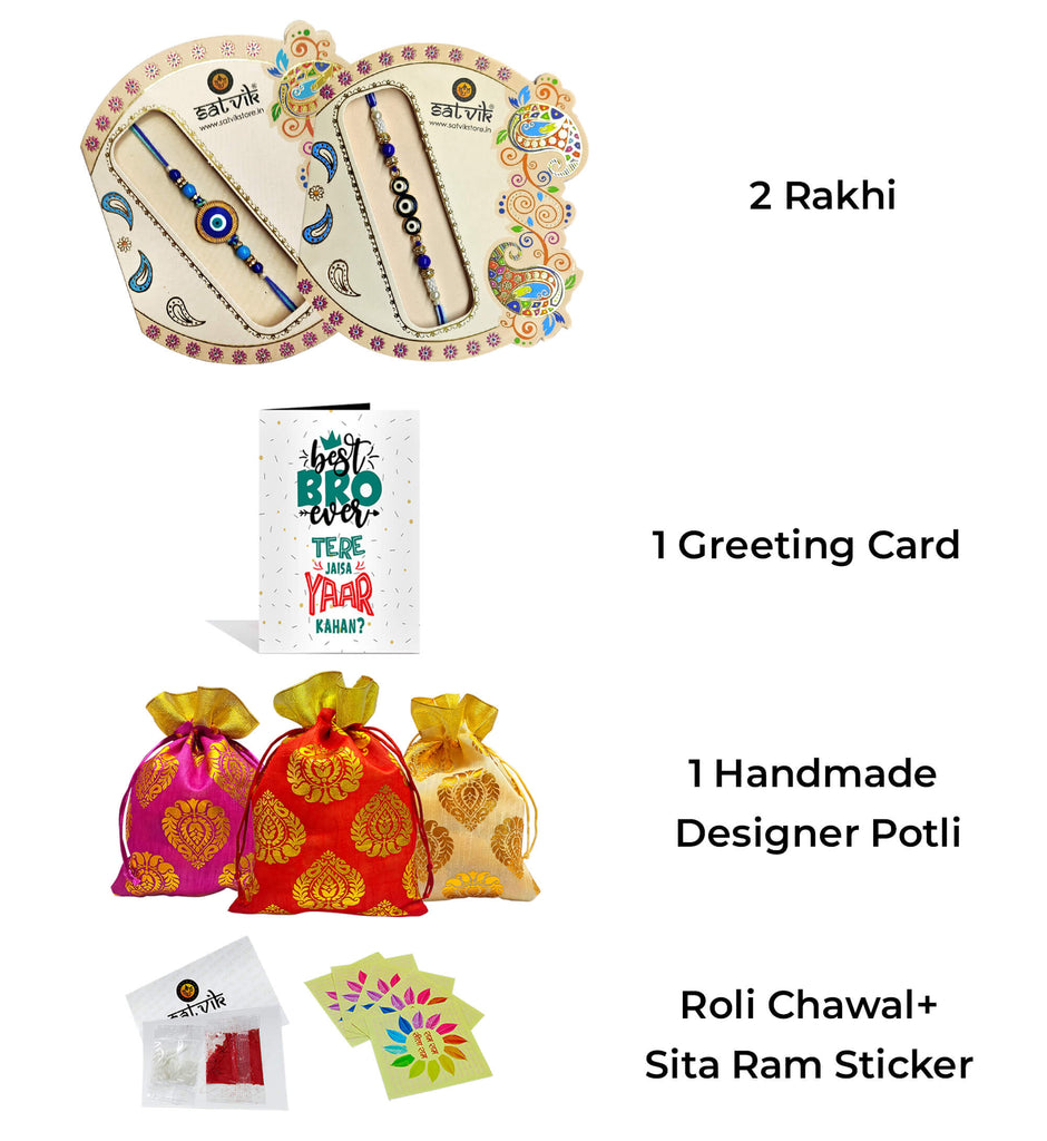 In this Box you will get Evil Eye Eye, Potli, Roli Chawal, Greeting Card, Holy Soun (Ram Sita Stickers). Send your Love to your brother with this Rakhi Set. It will Make Rakshabandan Memorable.