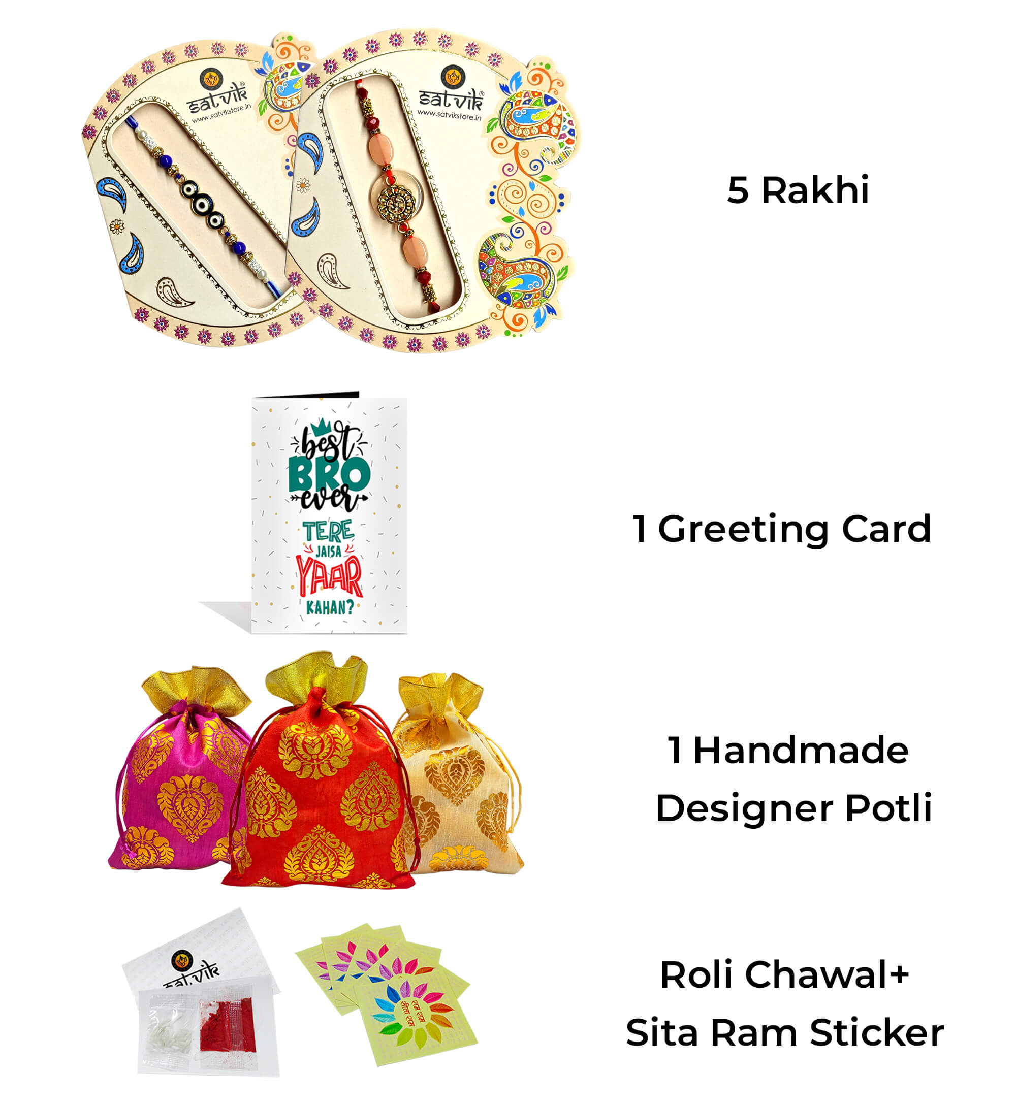 In this box you will receive Evil Eye Rakhi And Golden Pastel Stone Rakhi along with greeting Card, Potli, Roli Chawal, Holy Soun Stickers.
