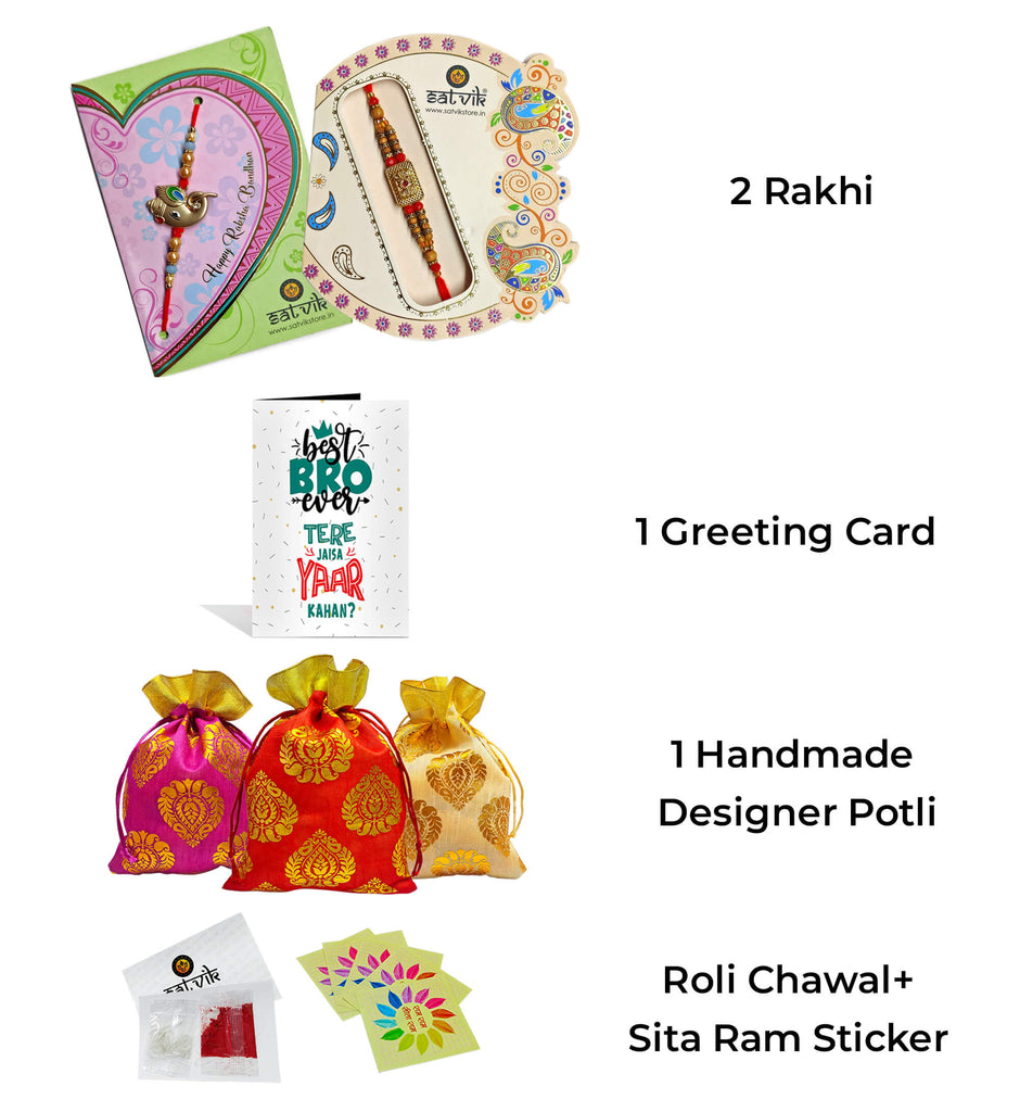 • Package: Set of 2 Ganesh Rakhi & multi Beads Rakhi with Tilak set ( Roli Chawal ) and Holy Soun ( Ram Sita Stickers). All Rakhi are same as shown in picture.