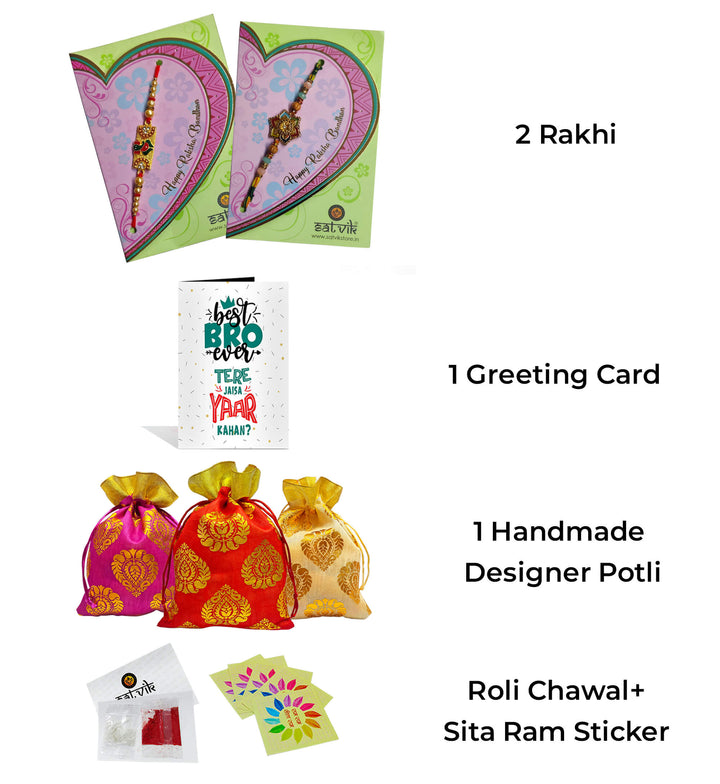 In this Box you will get Ganpati And Multicolor Floral Rakhi Potli, Roli Chawal, Greeting Card, Holy Soun (Ram Sita Stickers). Send your Love to your brother with this Rakhi Set. It will Make Rakshabandan Memorable.