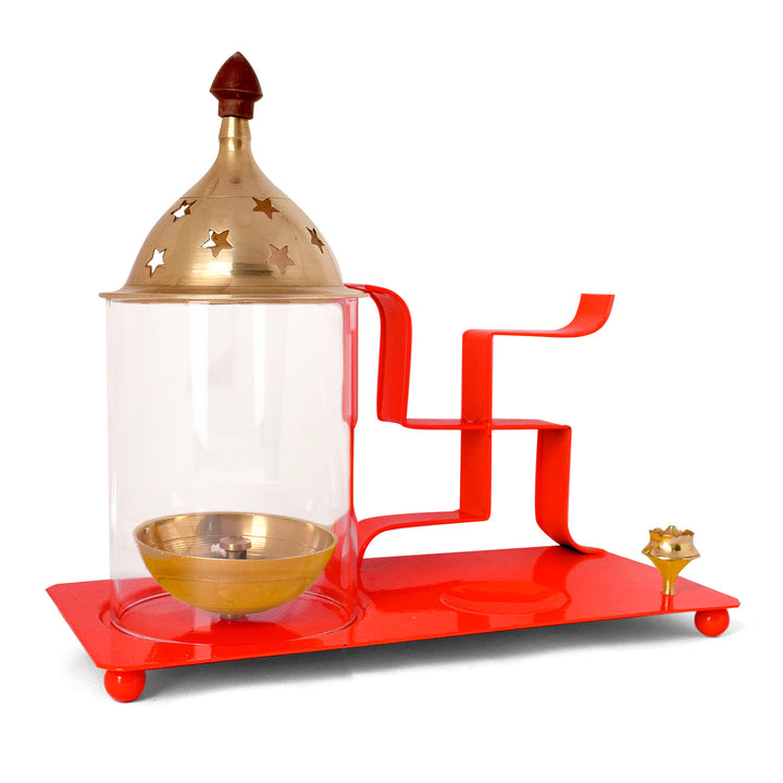 Brass & Metal Swastik Chimney Diya Tray with Incense Holder Small (Red)
