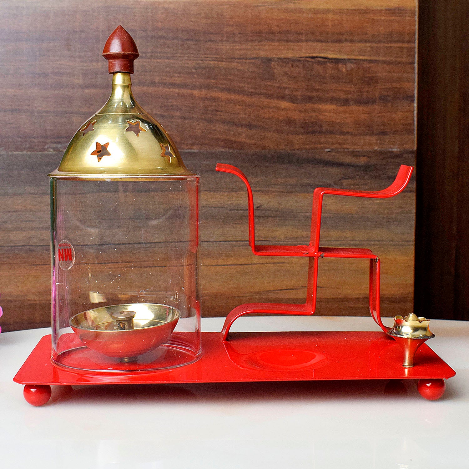 Swastik Diya Tray | small red diya tray | brass incense holder | metal pooja tray | decorative chimney diya | Diwali diya set | traditional pooja accessory | Swastik diya plate | red pooja tray | incense diya stand |