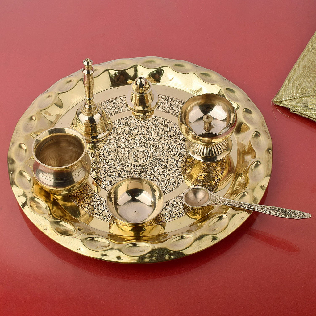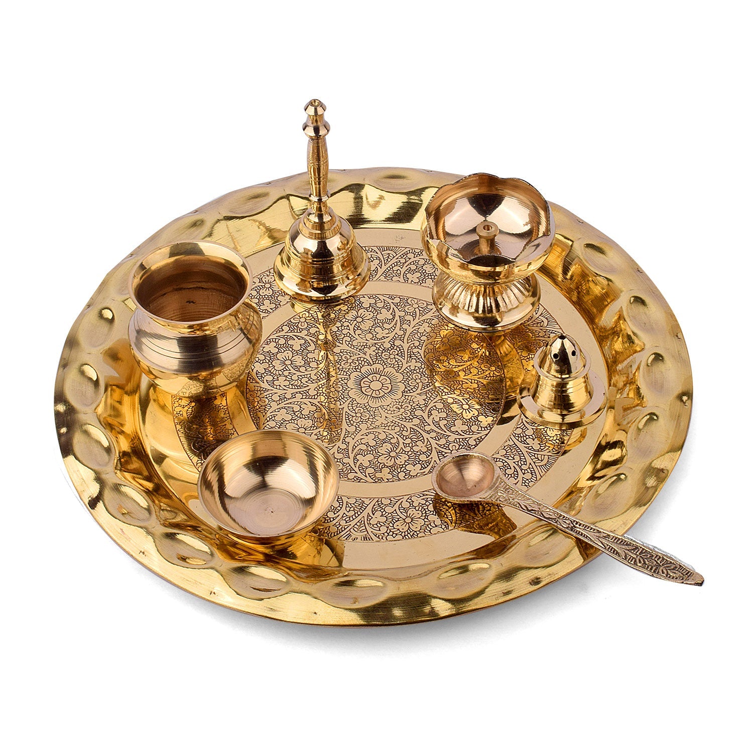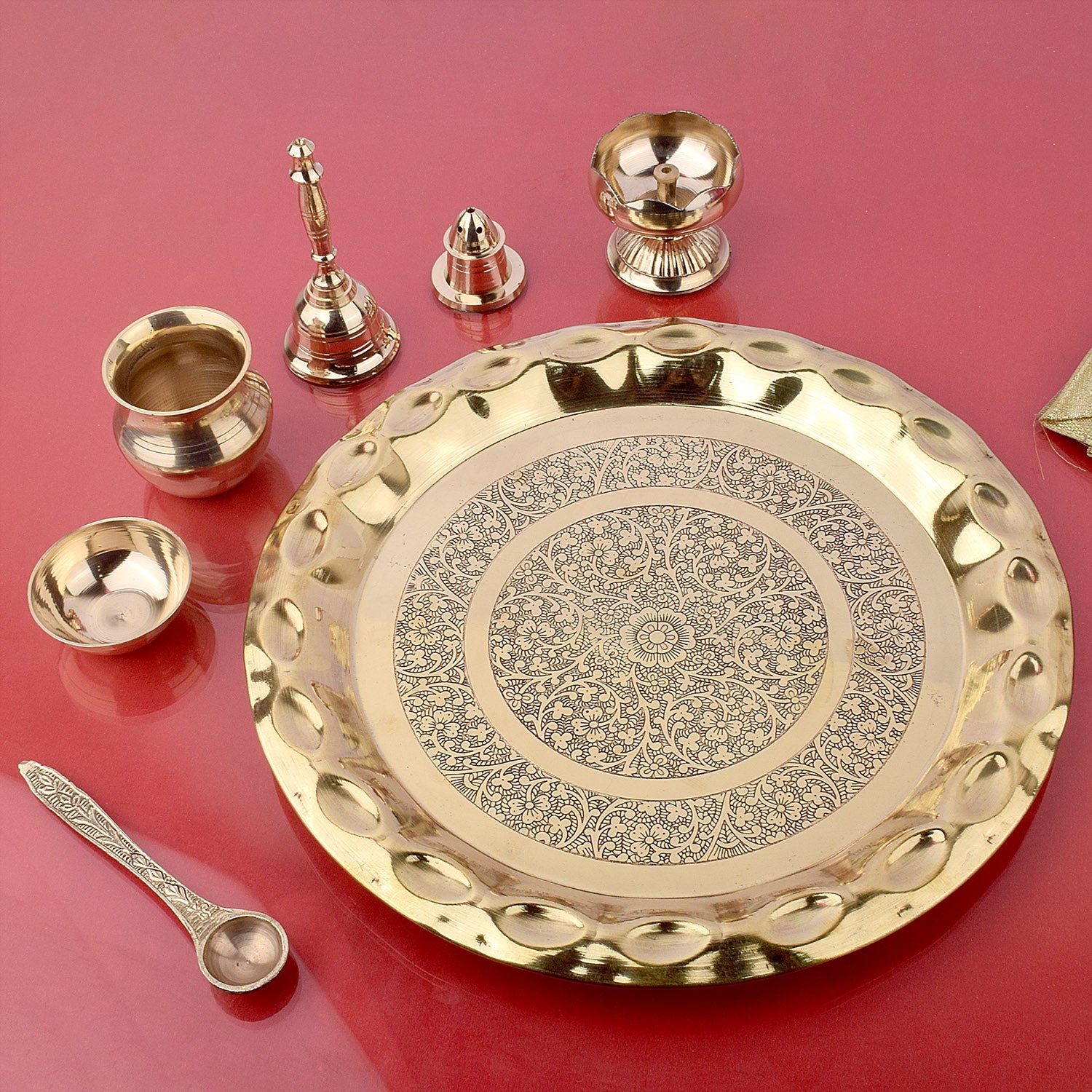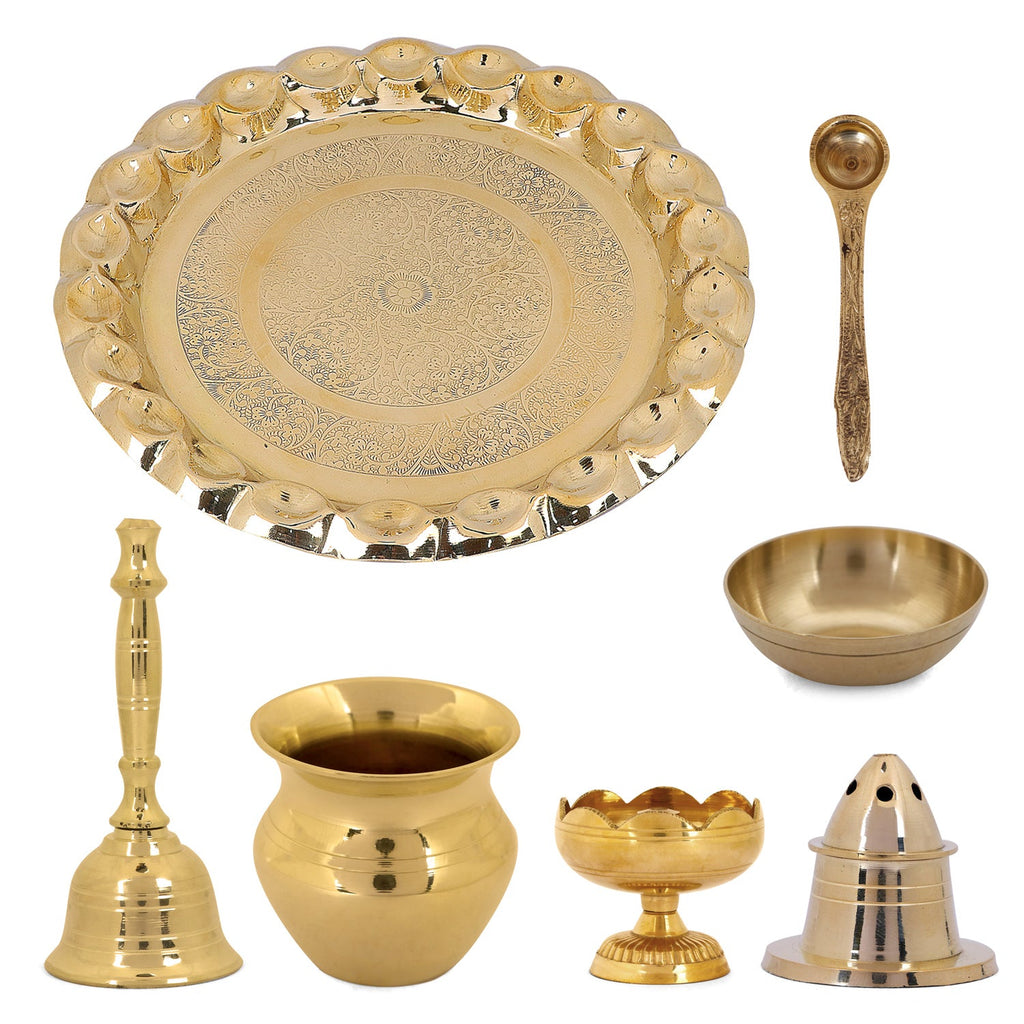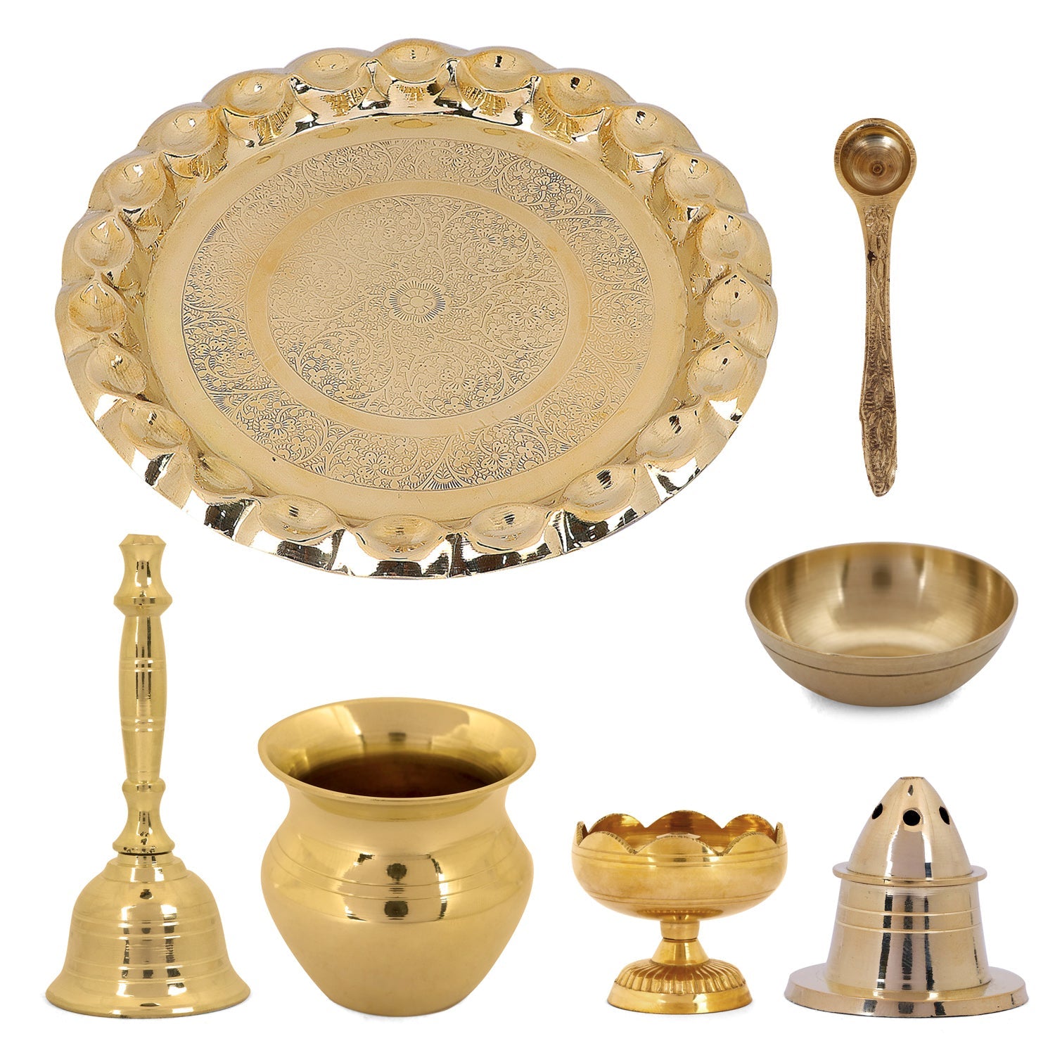 Package Content: 7 Pc set of 1 Puja Thali, 1 Ghanti (Bell),1 Puja Bowl, 1 Agarbatti Holder, 1 Brass Kalash(Lota), 1 Aarti Diya, 1 Spoon are the best suitable for Pooja