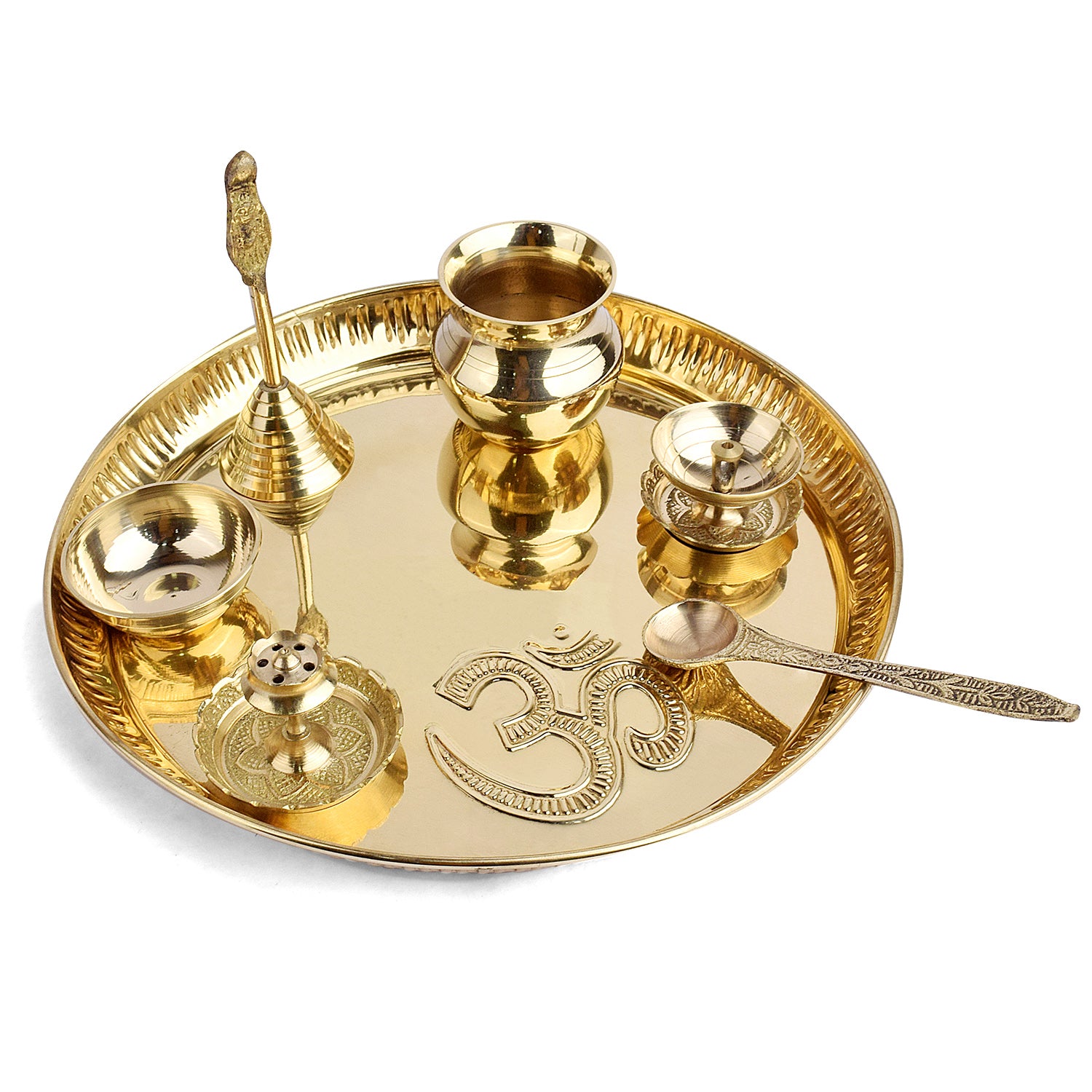Package Content: 7 Pc set of 1 Puja Thali, 1 Ghanti (Bell),1 Panch Patra, 1 Agarbatti Holder, 1 Brass Kalash(Lota), 1 Panchmukhi Diya, 1 Spoon are the best suitable for Pooja