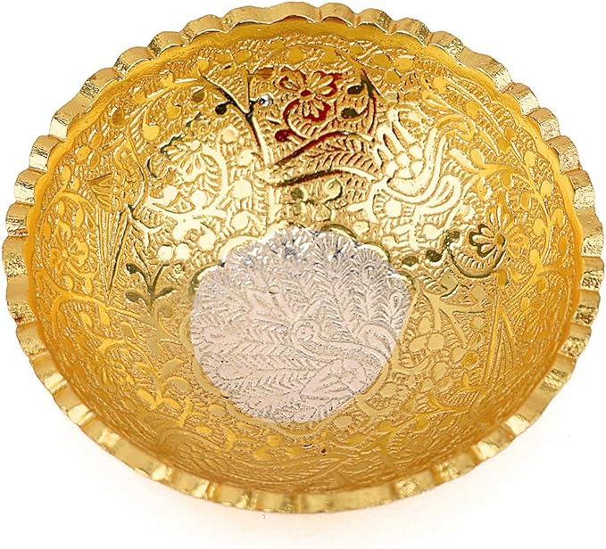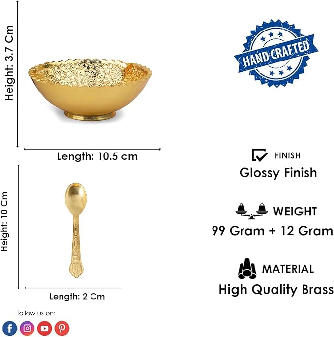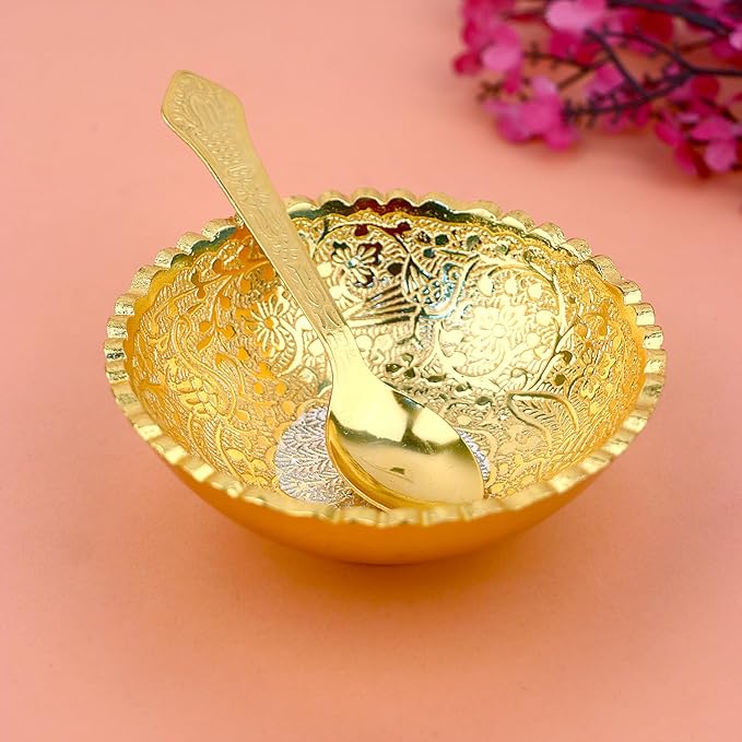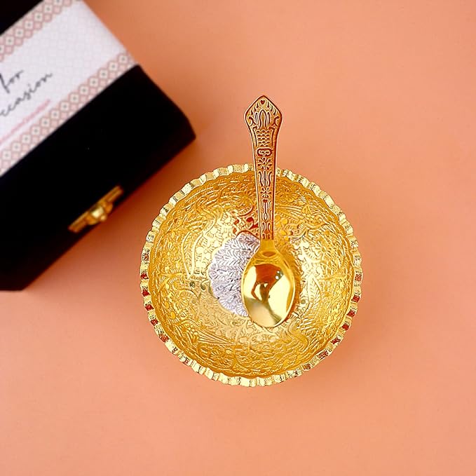 • Material: Aluminium With Gold Silver Plating , Dimensions(Bowl) : Length - 10.5 cm, Width: 10.5 cm, Height : 3.7 cm, Weight: 99 Gram :: Spoon : Height - 10 cm & Width- 2 cm