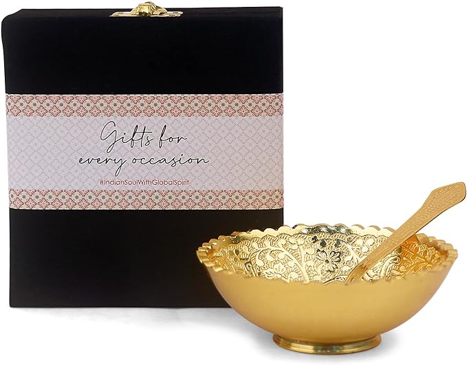 • Package Contains: 1 Pc Designer Embossed Bowl with 1 Spoon. This Set comes With Unique Royal Velvet Box Premium Gift Packing Set.