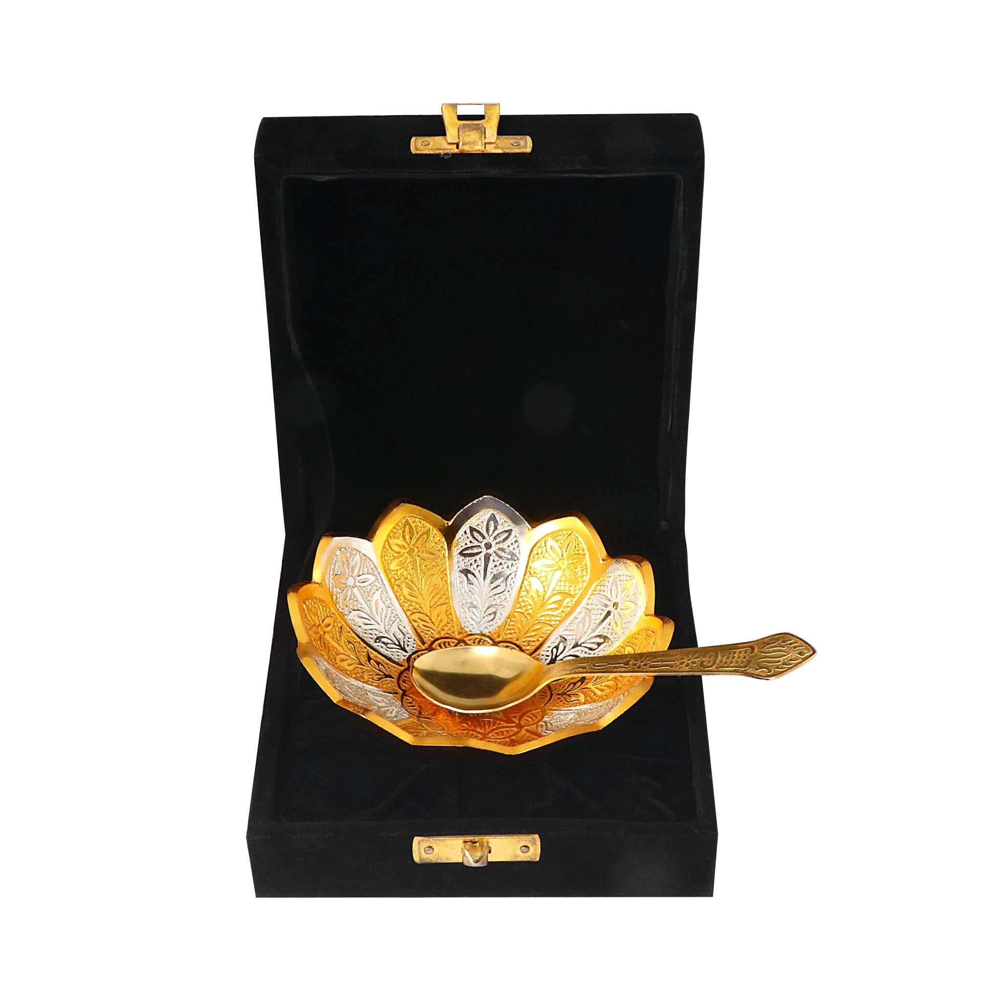 About Product: Satvik Presents Gifts for all Occasions. Satvik Presents Royal Wedding Diwali Housewarming Gift Set which comes with Unique Royal Velvet Box Premium Gift Packing Set. The Bowl Set is made of Aluminum with Gold Silver Plated, This Bowl Set has eye-catching accents on its exterior. Sporting a silver finish, this Bowl Set makes a wonderful gift for Friends, Family, Corporate Gifting, Colleagues, and Business gifts. Christmas Gift, Perfect Gift.