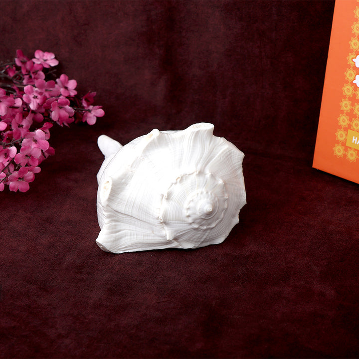 About Product:  Bring home the Sacred Dakshinavarti Valampuri Shankh (6.5 Inch), a rare and auspicious right-turning conch revered in Hindu scriptures. Placing this authentic Valampuri Shankh in your pooja room, temple, or worship space is believed to invite the blessings of Maa Lakshmi and Lord Vishnu, bring prosperity, positive energy, and remove negative influences. Its divine sound, when blown during aarti, puja, or rituals, purifies the environment a0nd enhances the sanctity of your spiritual space. Each piece is naturally formed and unique, making it a perfect addition to your home mandir or a thoughtful spiritual gift for festivals and sacred occasions.