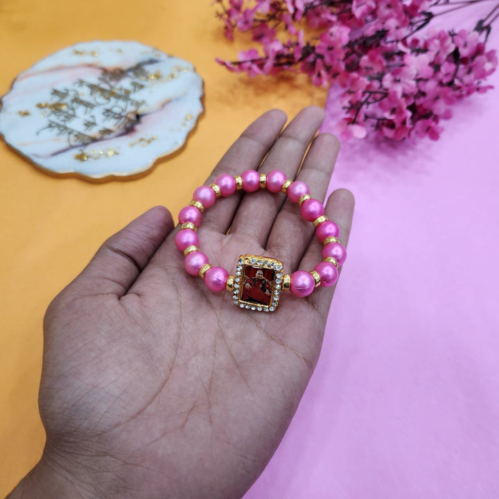 Pink Round Pearl Bracelet with Jai Guruji Swaroop Handmade Bracelets f – Satvikworld.com