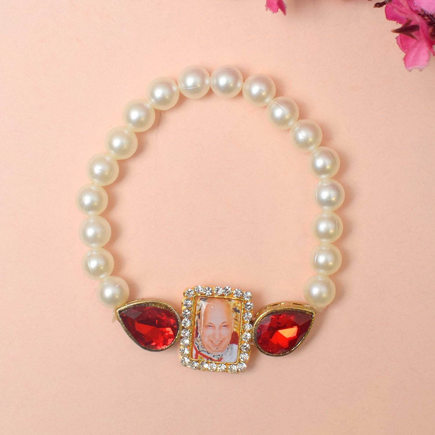 • Item Name: White Pearl and Red Stone Bracelet with Jai Guruji Swaroop