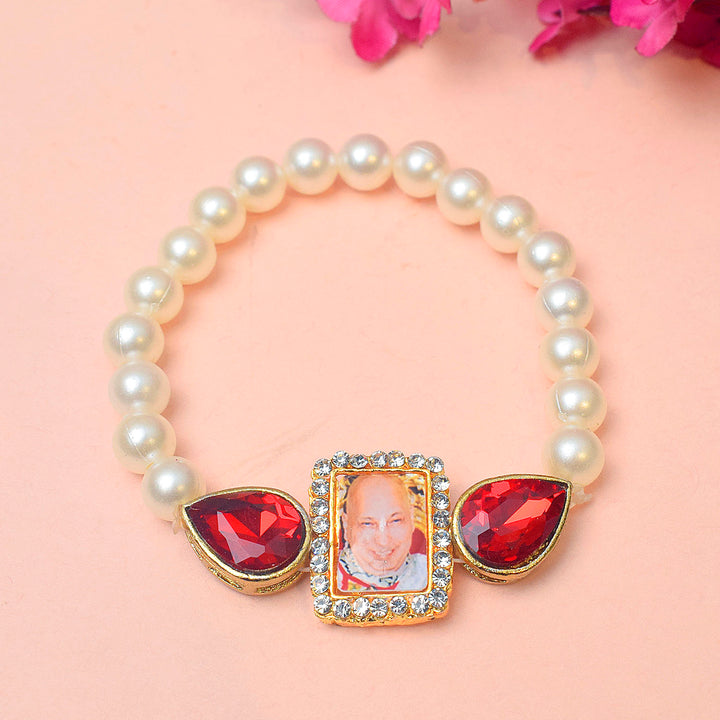 White Pearl and Red Stone Bracelet with Jai Guruji Swaroop Handmade Bracelets for Men and Women