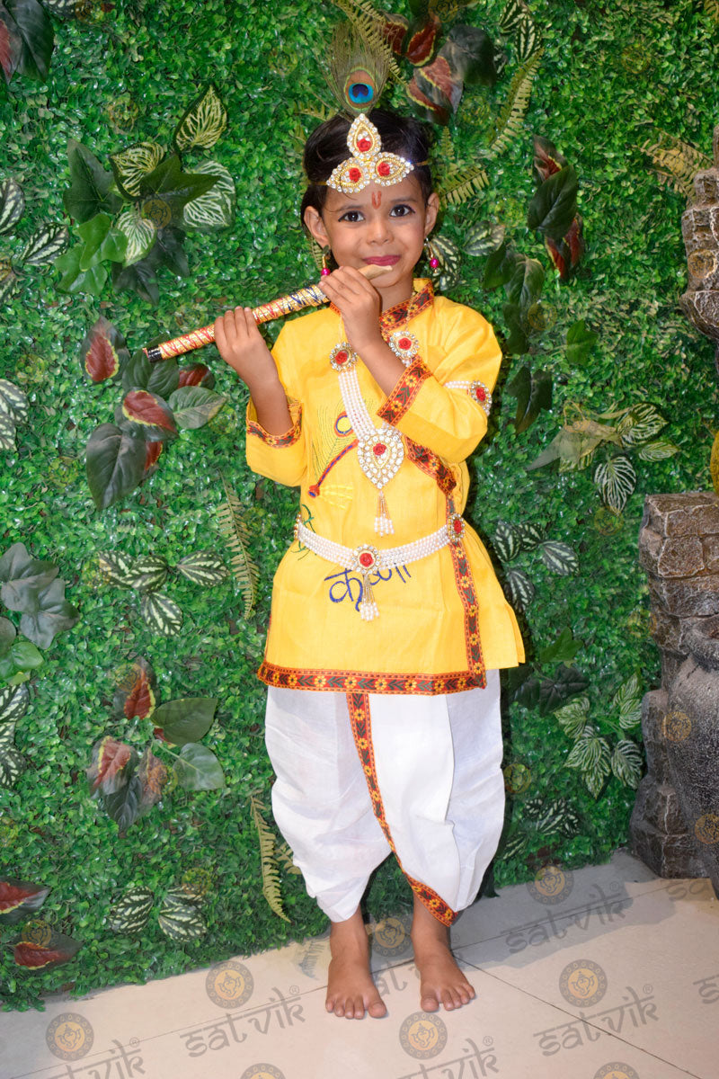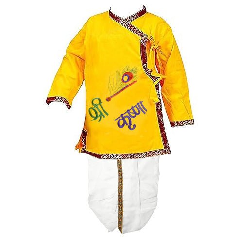 About Product: Embrace the spirit of Janmashtami with our enchanting Kids' Krishna Dhoti Kurta Dress Costume, meticulously crafted from premium-quality cotton fabric. Perfect for your little one to embody the divine persona of Lord Krishna during festive celebrations. Made with comfort in mind, this costume ensures your child stays comfortable while enjoying the festivities. Explore our collection now and make this Janmashtami truly memorable with our exquisite costume. Order today and let your child shine as the charming Krishna!