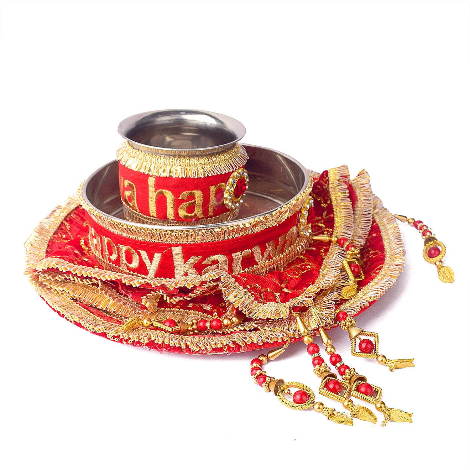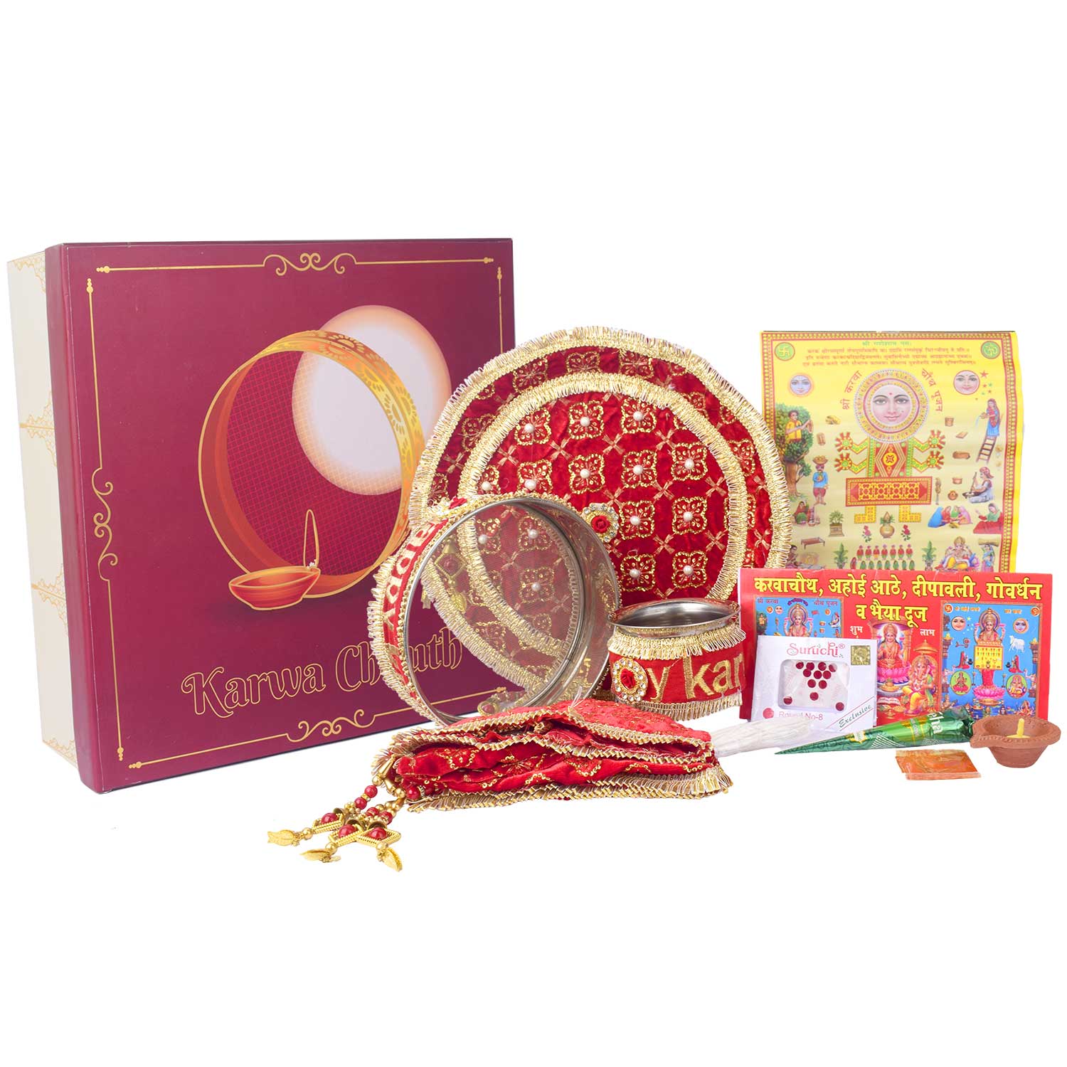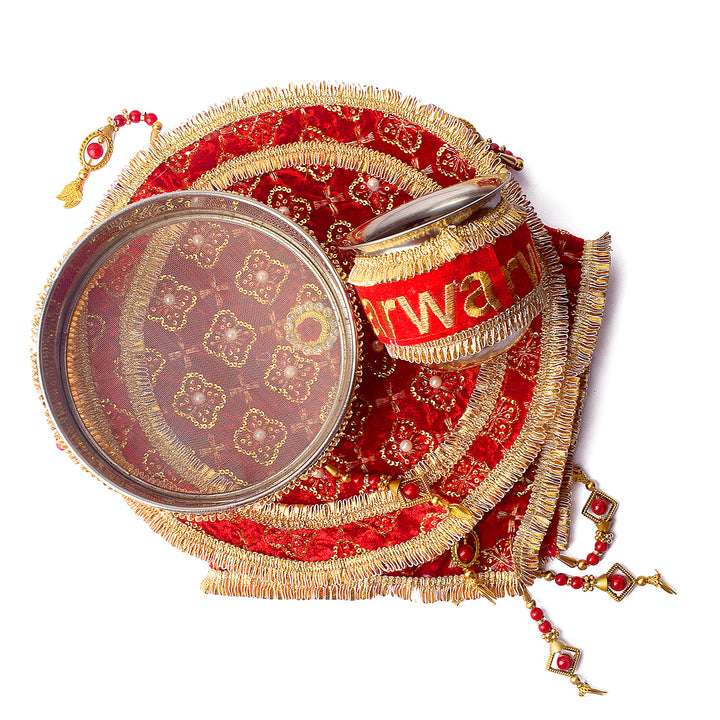 Shop Now Red Embroidery Karwa Chauth Thali Set 11 Pc | Satvikworld.com