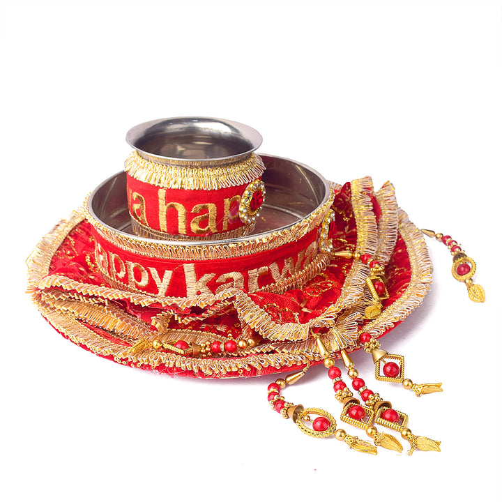 11 Pc Red Embroidery Karwa Chauth Thali Set