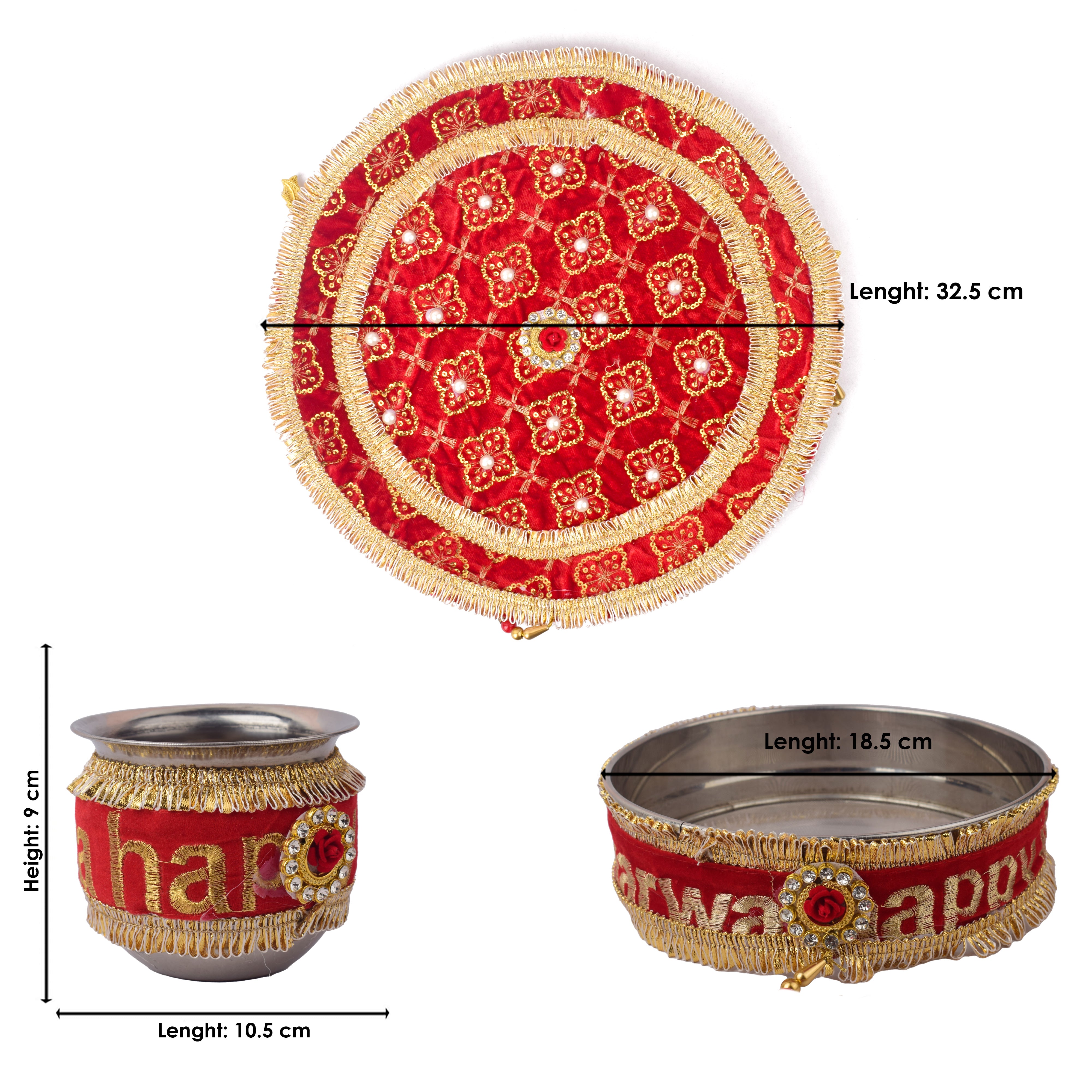 Red Karwa Chauth Thali Set | Embroidered Karwachauth Kit | Designer Red Pooja Thali | Karwa Chauth Puja Samagri | Traditional Karwa Chauth Thali with Cover | Channi and Lota Set | Karwa Chauth Essentials | Red Pooja Thali for Karva Chauth | Karwa Chauth Gift Set