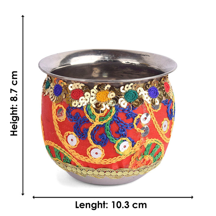 Design: Beautiful Handcrafted Designer Karwa Thali with Fabric all over the Thali and Lace Work all over the Lota and Sieve (Channi), Which makes it more Attractive.