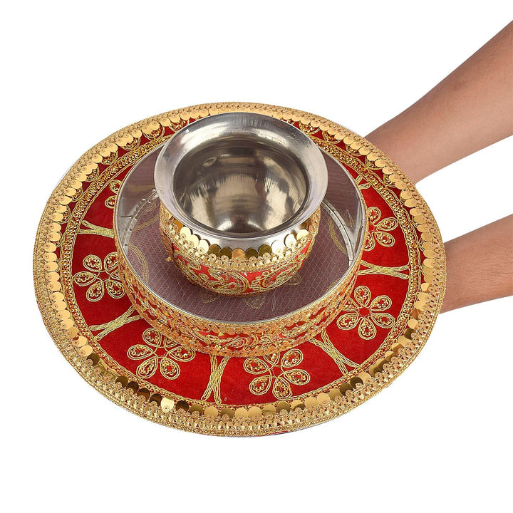 Golden Blossoms Karwa Chauth Thali with Floral Pattern|satvikworld.com – Satvikworld.com