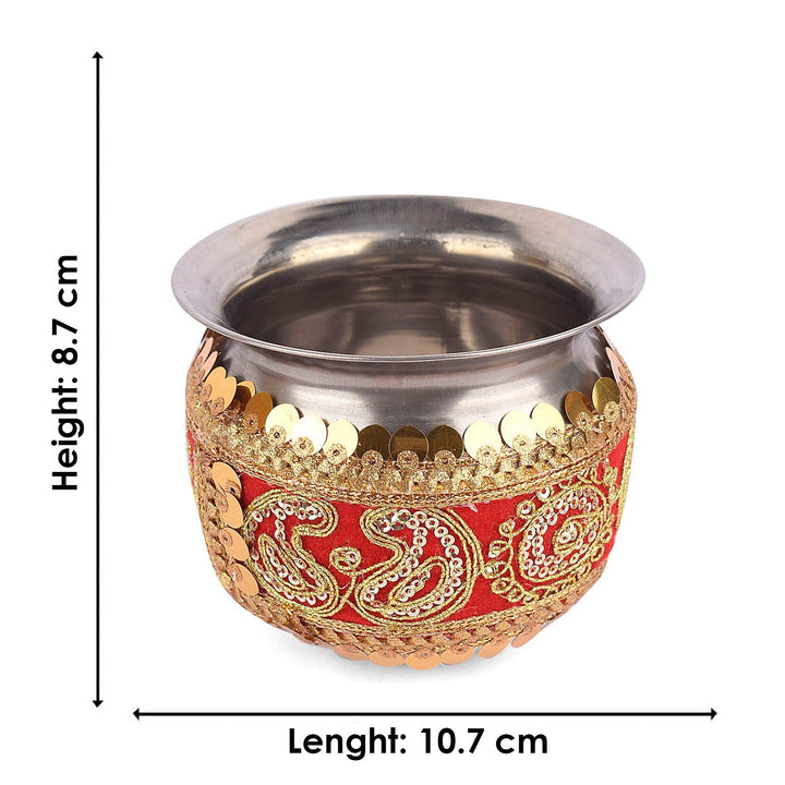 Design: Beautiful Handcrafted Designer Karwa Thali with Fabric all over the Thali and Lace Work all over the Lota and Sieve (Channi), Which makes it more Attractive.