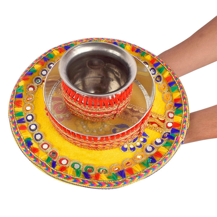 Handcrafted Yellow Karwa Chauth Thali Set - 3pc