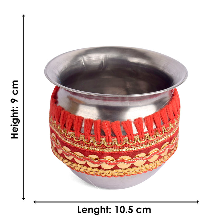Design: Beautiful Handcrafted Designer Karwa Thali with Fabric all over the Thali and Lace Work all over the Lota and Sieve (Channi), Which makes it more Attractive.