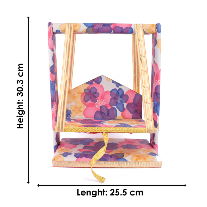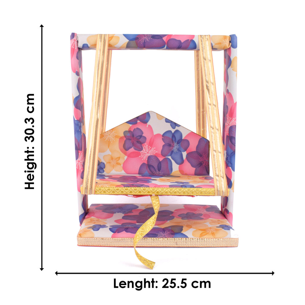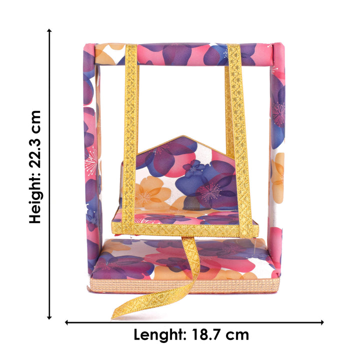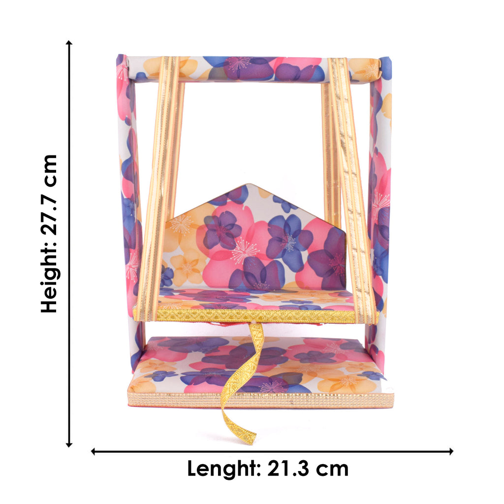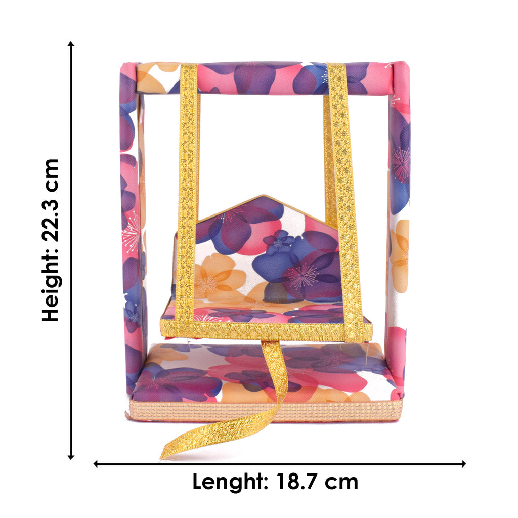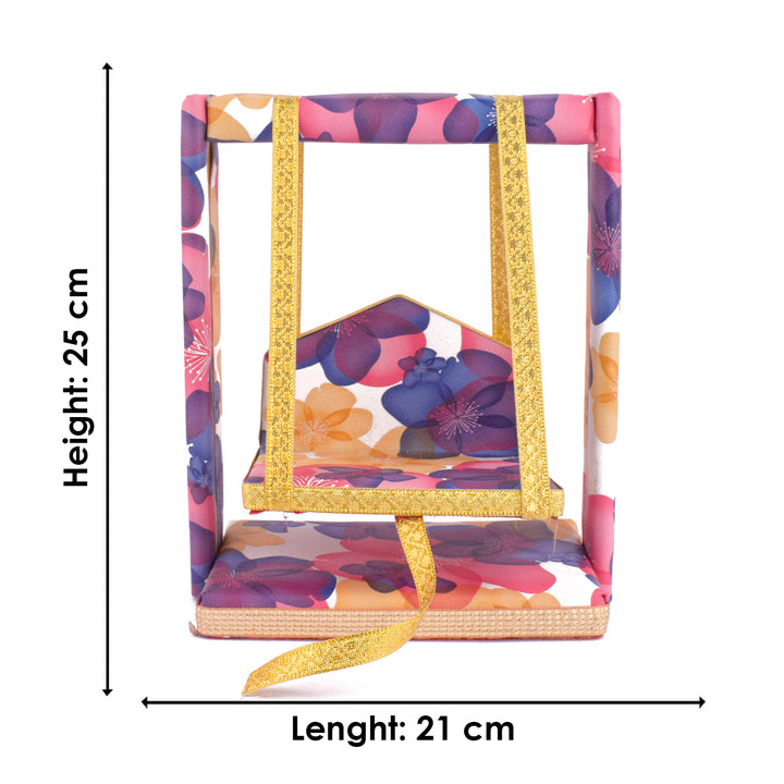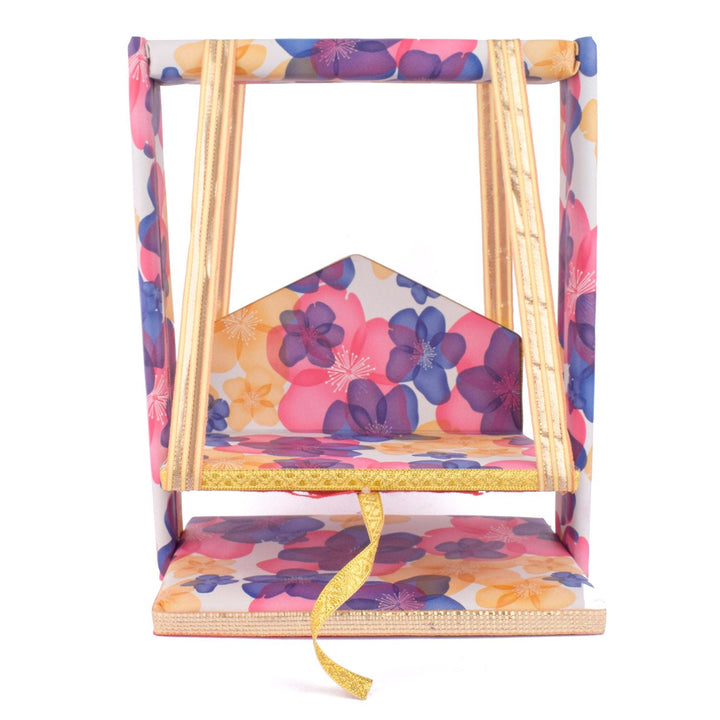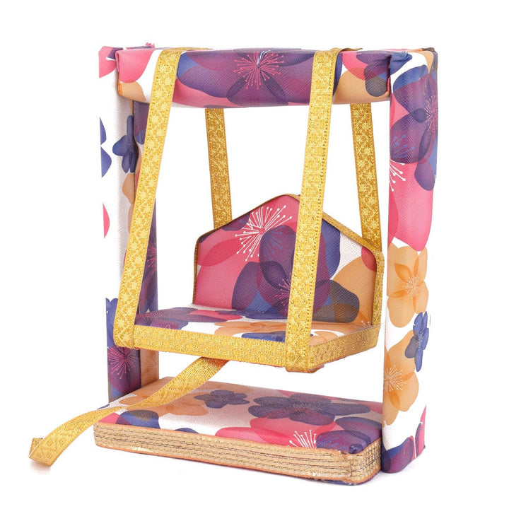laddu gopal jhula | divine gopal swing | floral printed laddu gopal jhula | krishna swing for janmashtami | decorative jhula for bal gopal | gopal swing with floral print | laddu gopal pooja jhula | wooden jhula for kanha ji | bal gopal swing for temple | designer jhula for laddu gopal