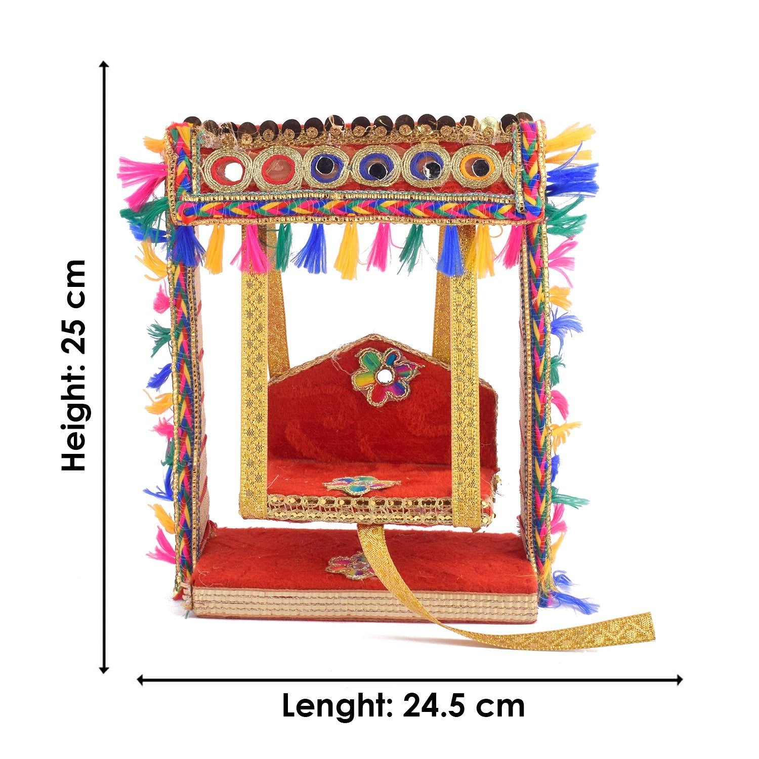 Add sparkle to your mandir with our Elegant Mirror Stone Jhula for Laddu Gopal, a stunning handcrafted swing combining traditional beauty with eye-catching embellishments. This wooden jhula is detailed with mirror stones and rich fabric, creating a sacred yet decorative touch for your Laddu Gopal Ji or Ganpati.