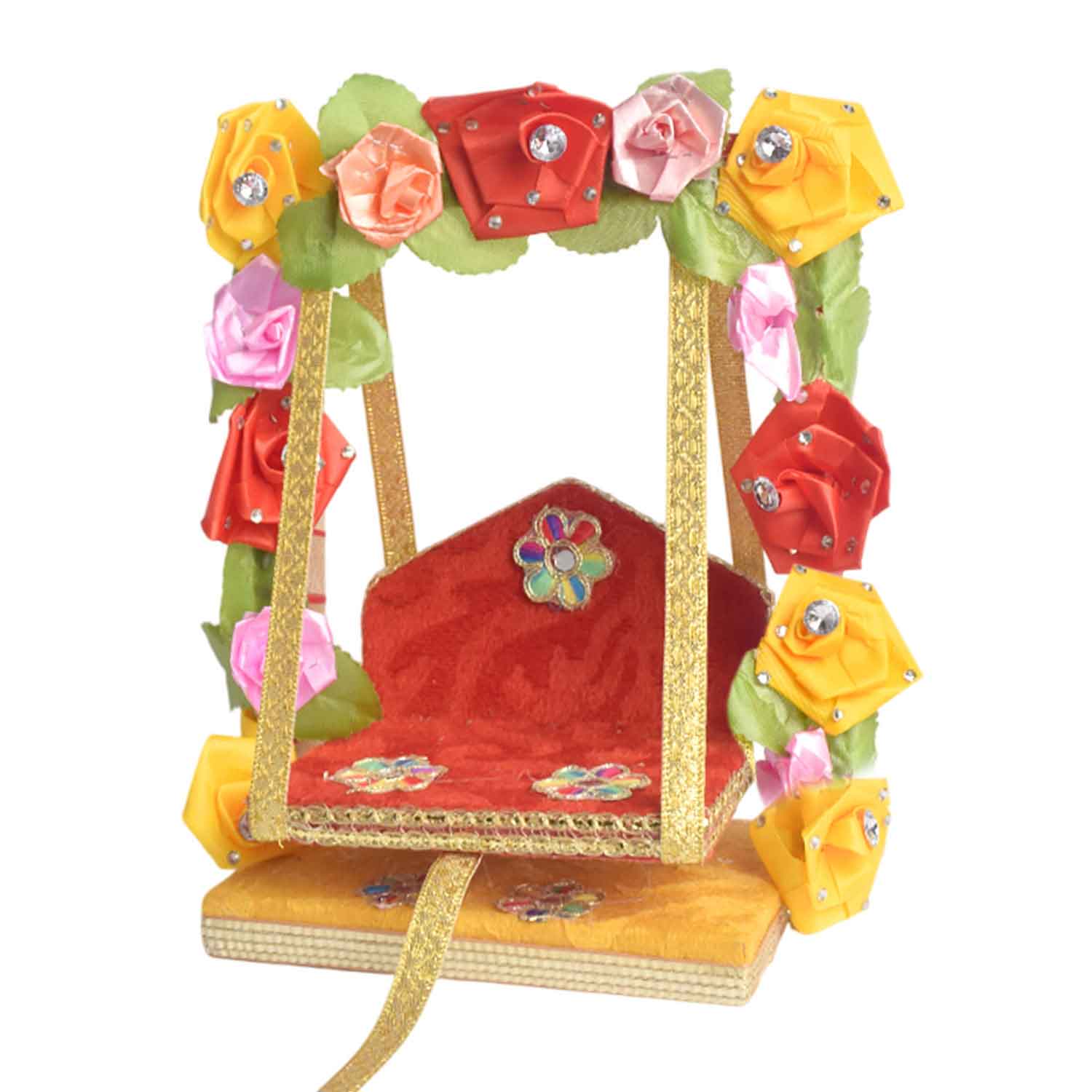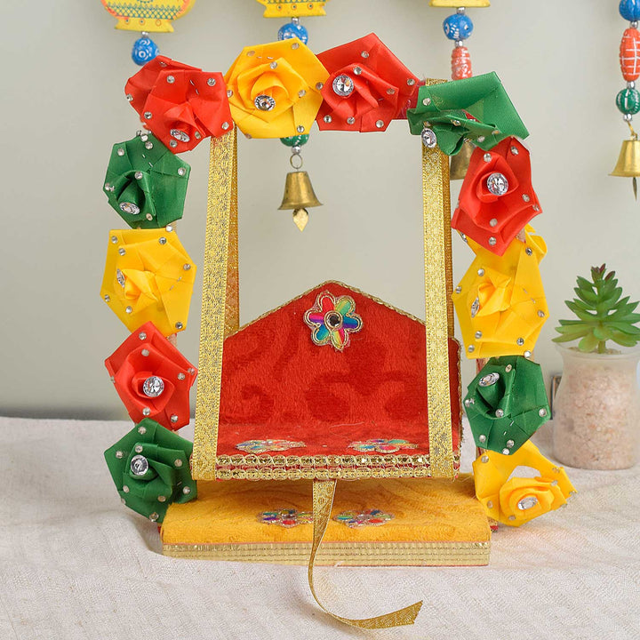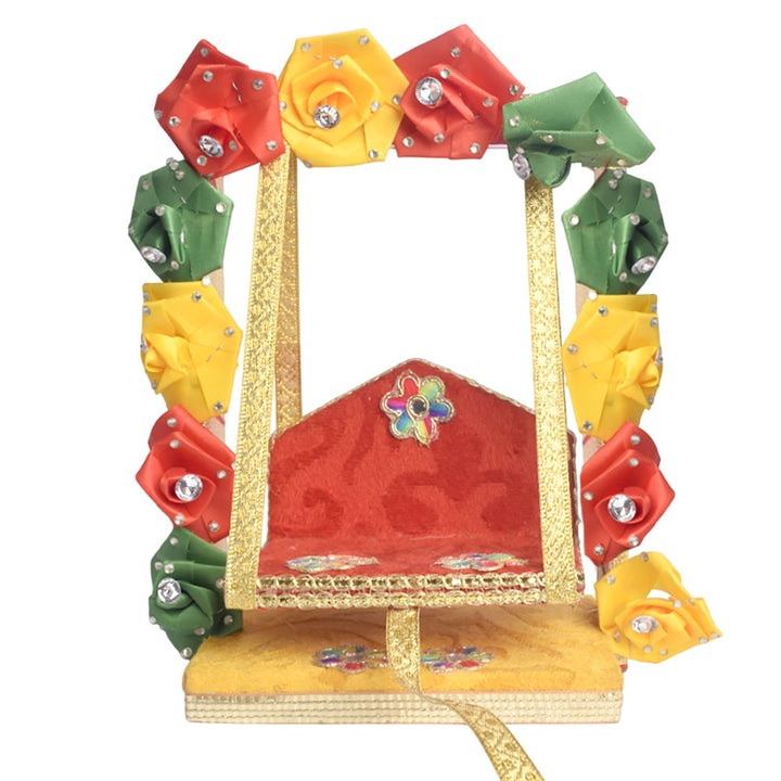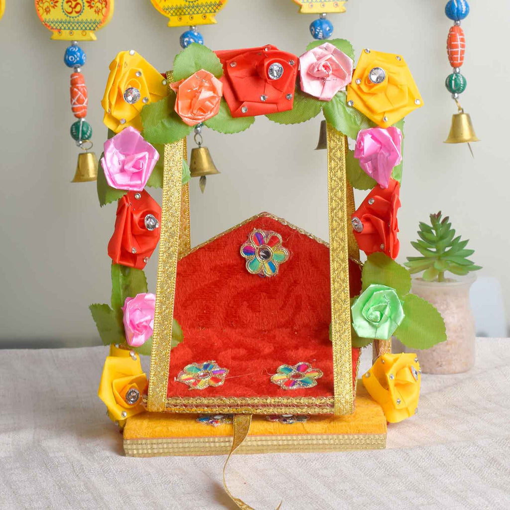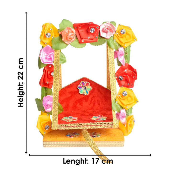 • Note: Features assorted floral designs—each piece uniquely adorned with charming faux flowers, making every jhula a distinctive expression of divine beauty.