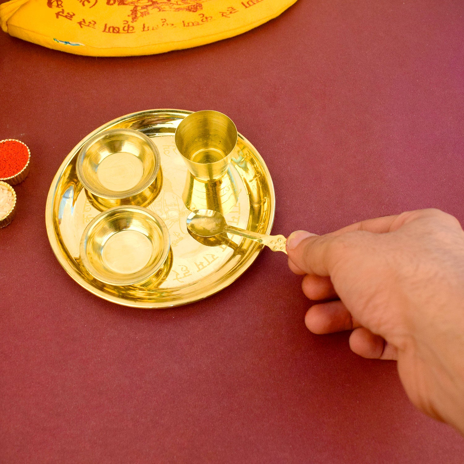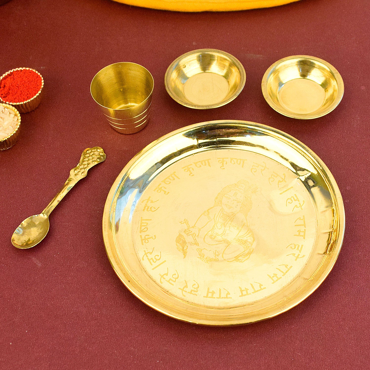 • Traditional and timeless, with diya, bell, incense holder, and roli chawal katori.