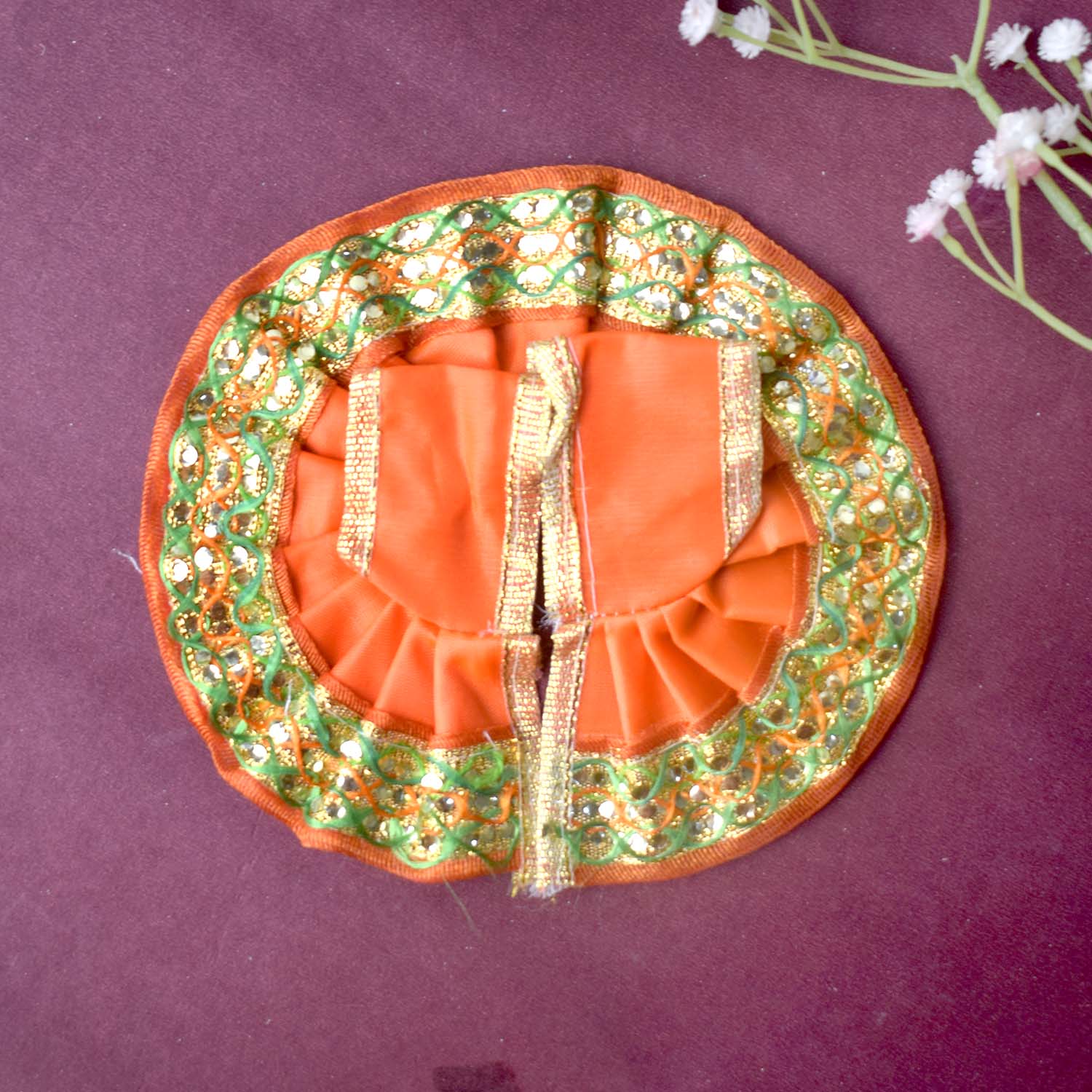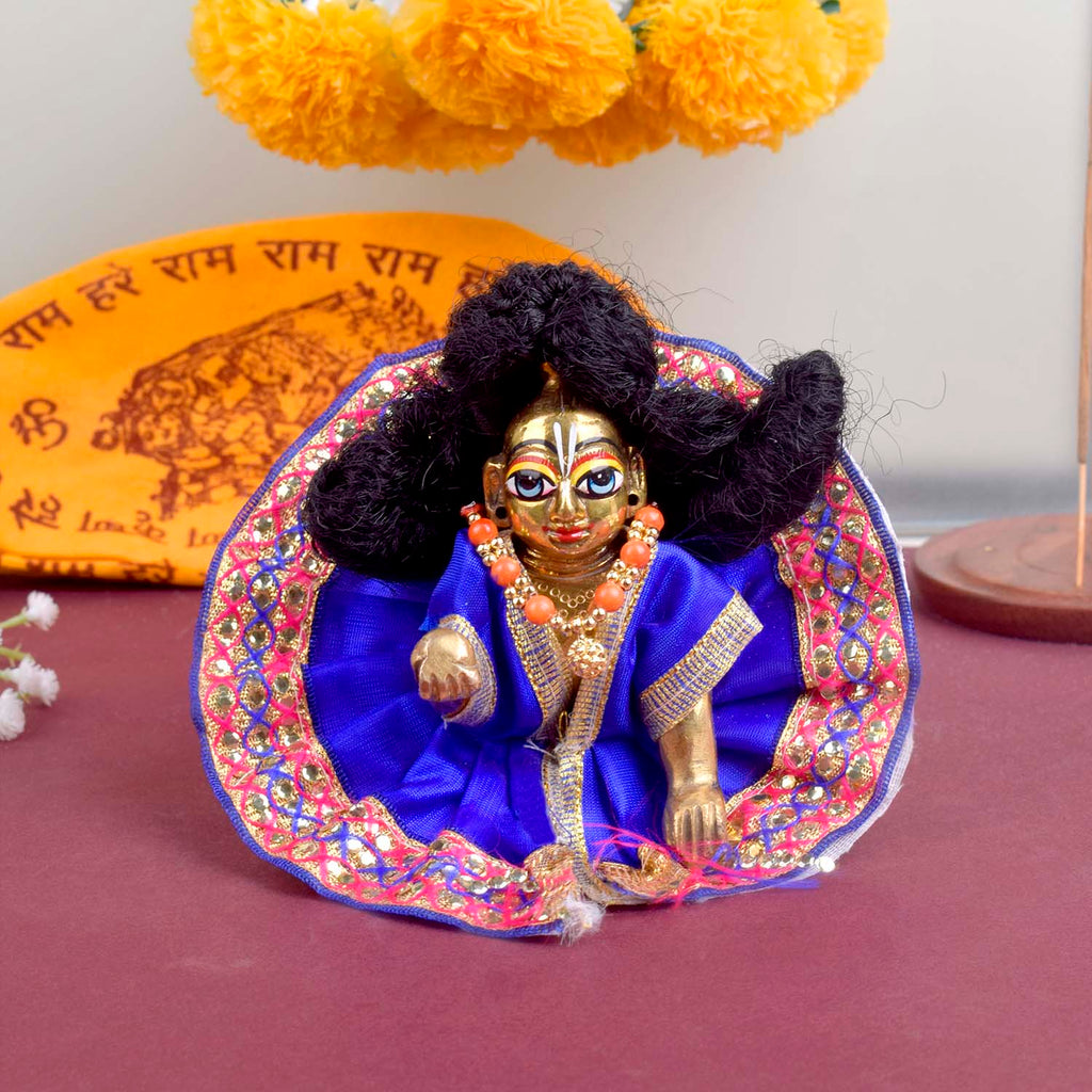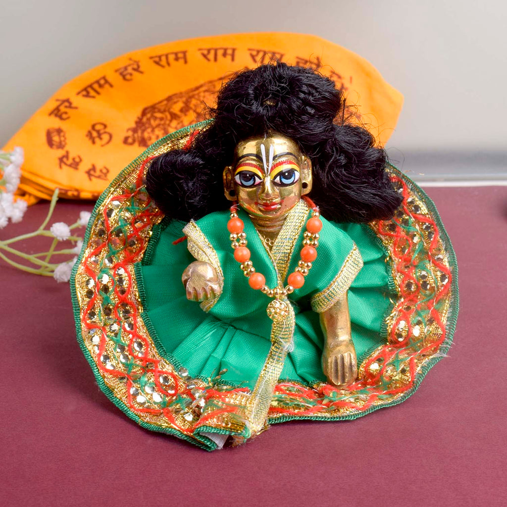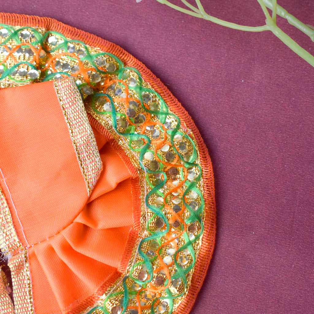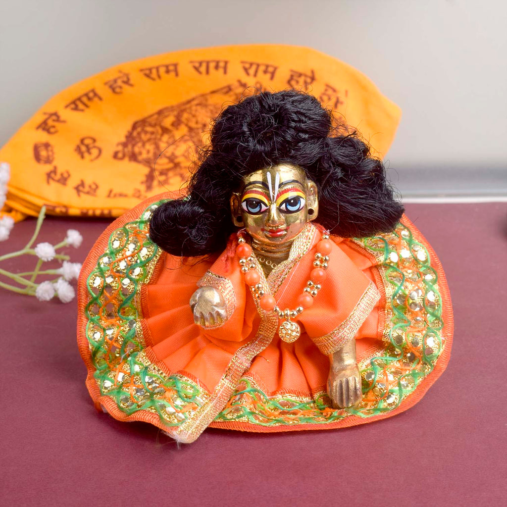 Available in blue, green, pink, orange, yellow, and red, and crafted to fit Laddu Gopal idols in sizes 1 and 2, this exquisite dress effortlessly combines tradition with a festive charm, making your deity’s appearance truly divine.