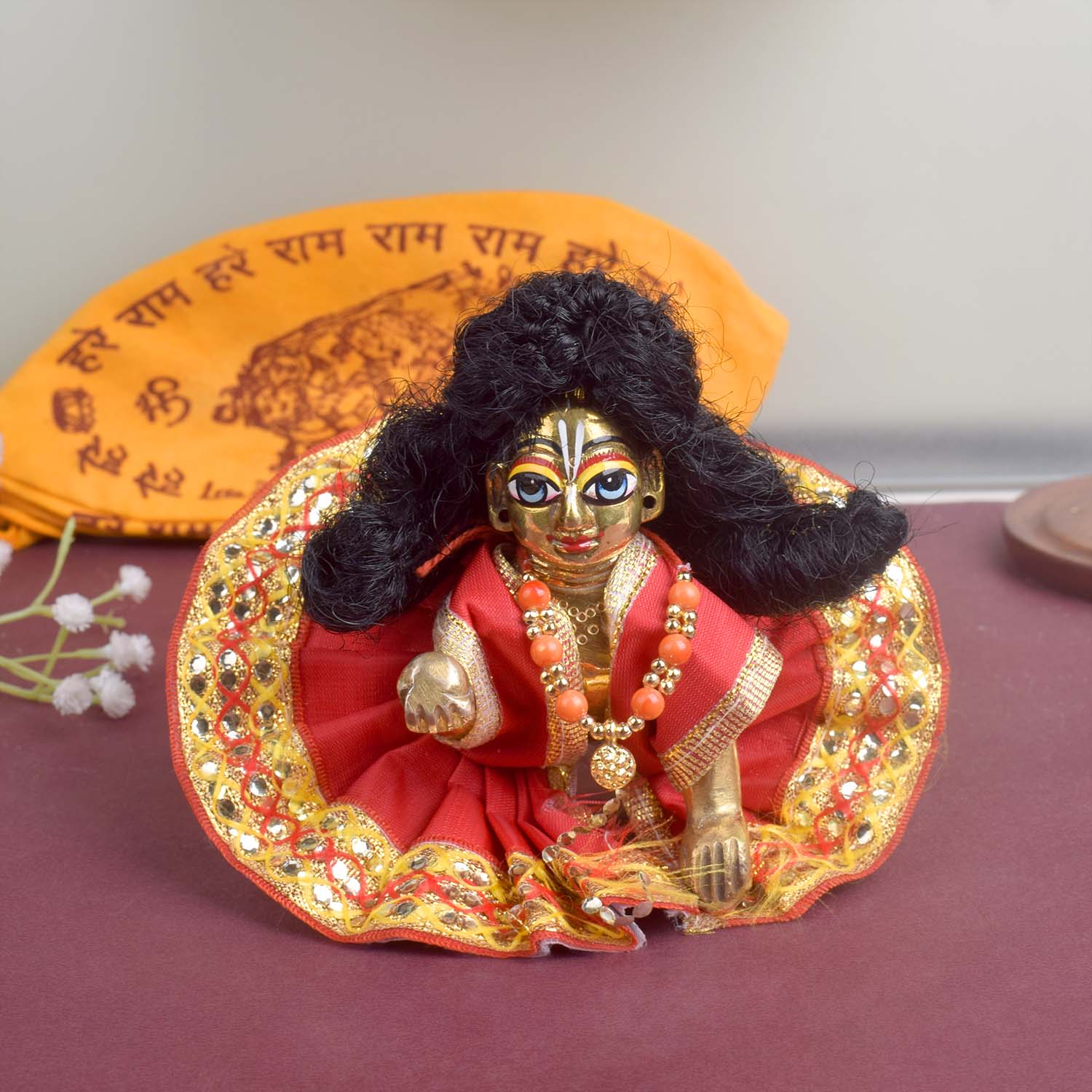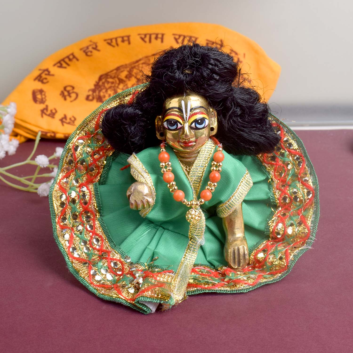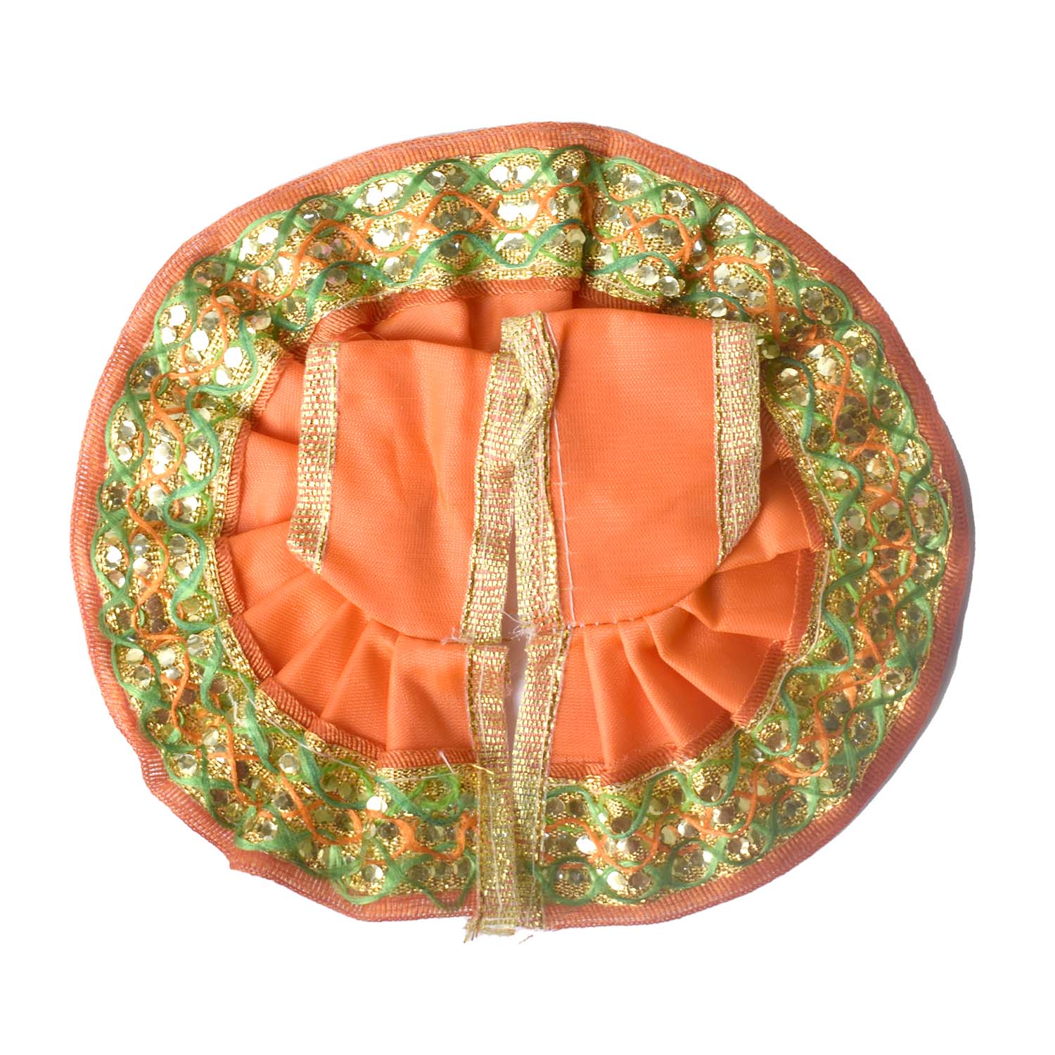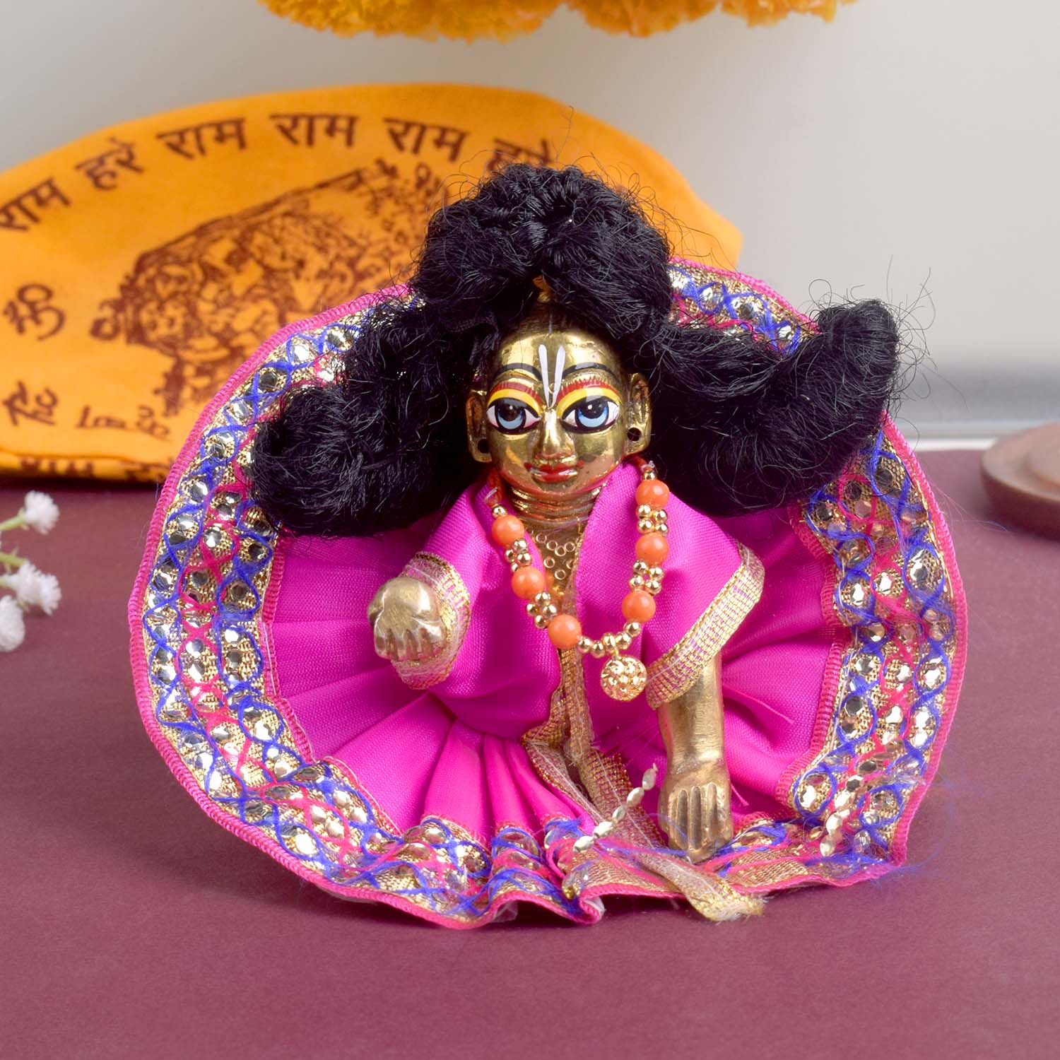 Available in blue, green, pink, orange, yellow, and red, and crafted to fit Laddu Gopal idols in sizes 1 and 2, this exquisite dress effortlessly combines tradition with a festive charm, making your deity’s appearance truly divine.