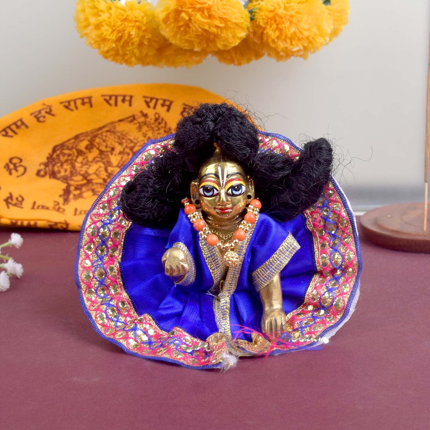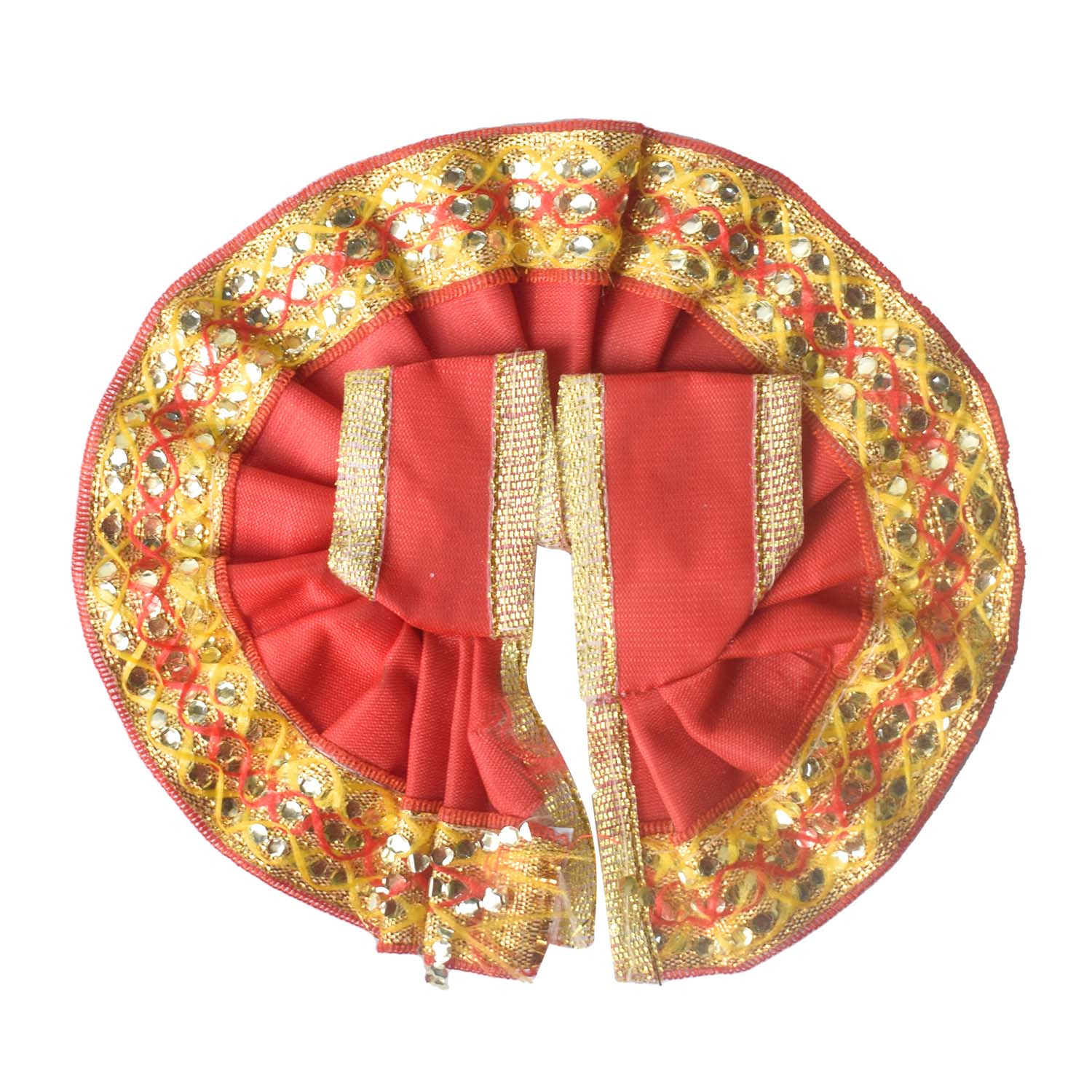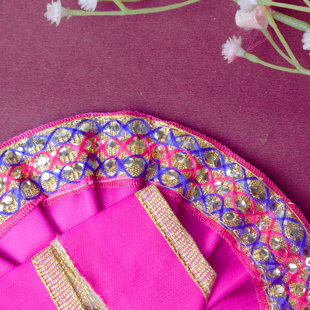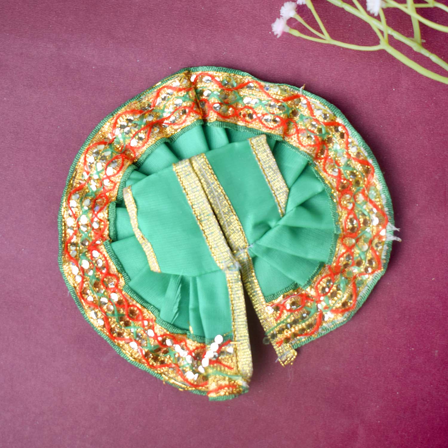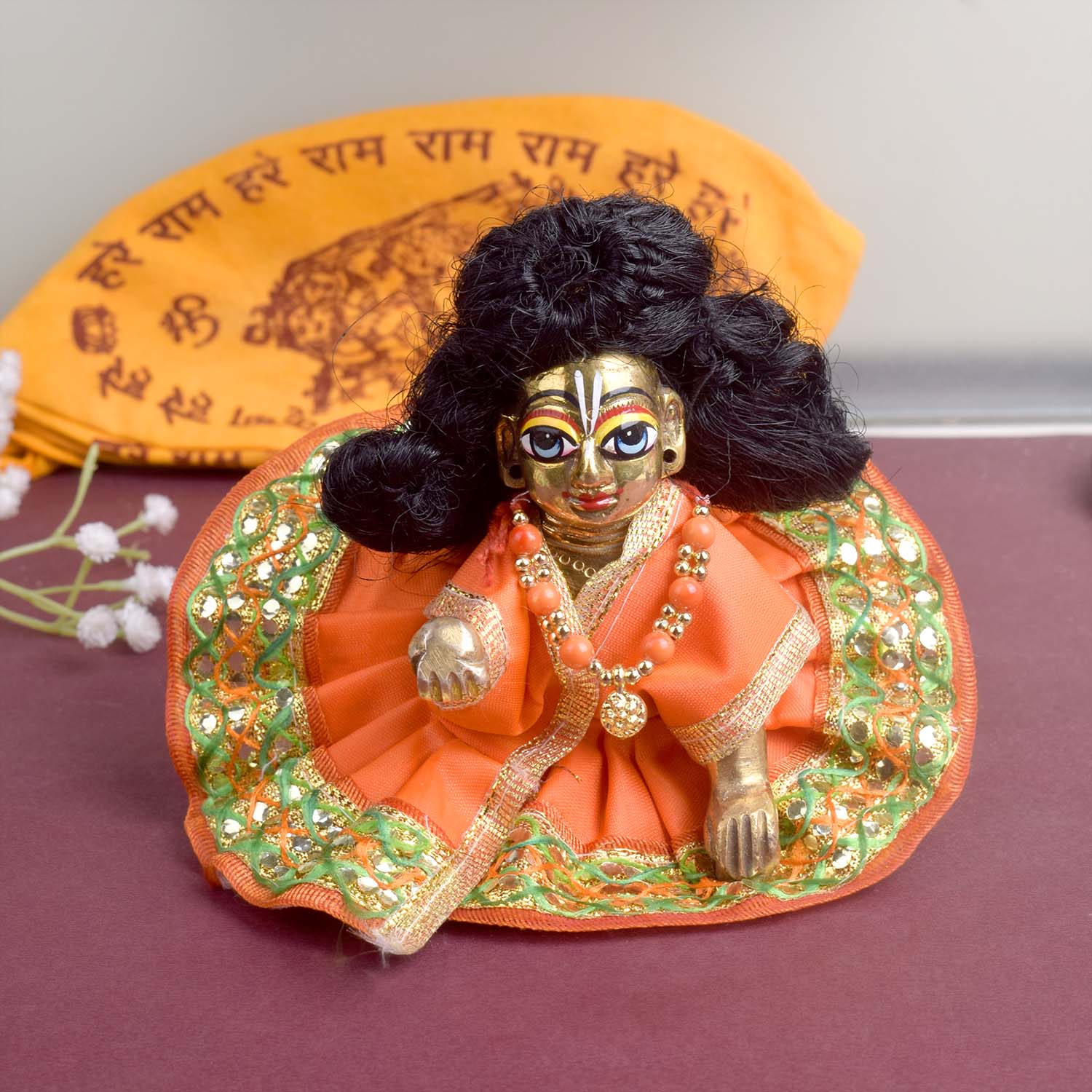 Available in blue, green, pink, orange, yellow, and red, and crafted to fit Laddu Gopal idols in sizes 1 and 2, this exquisite dress effortlessly combines tradition with a festive charm, making your deity’s appearance truly divine.