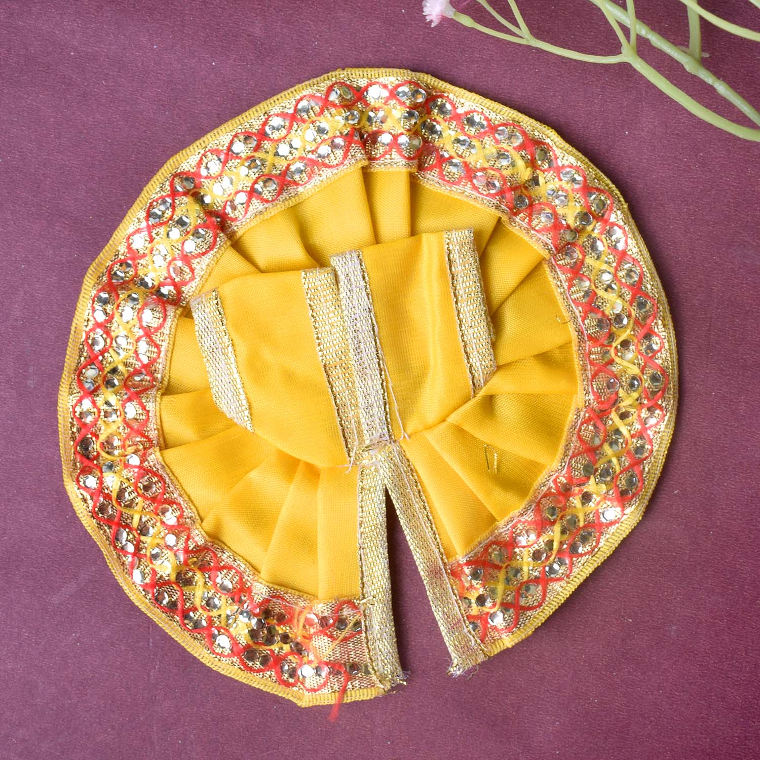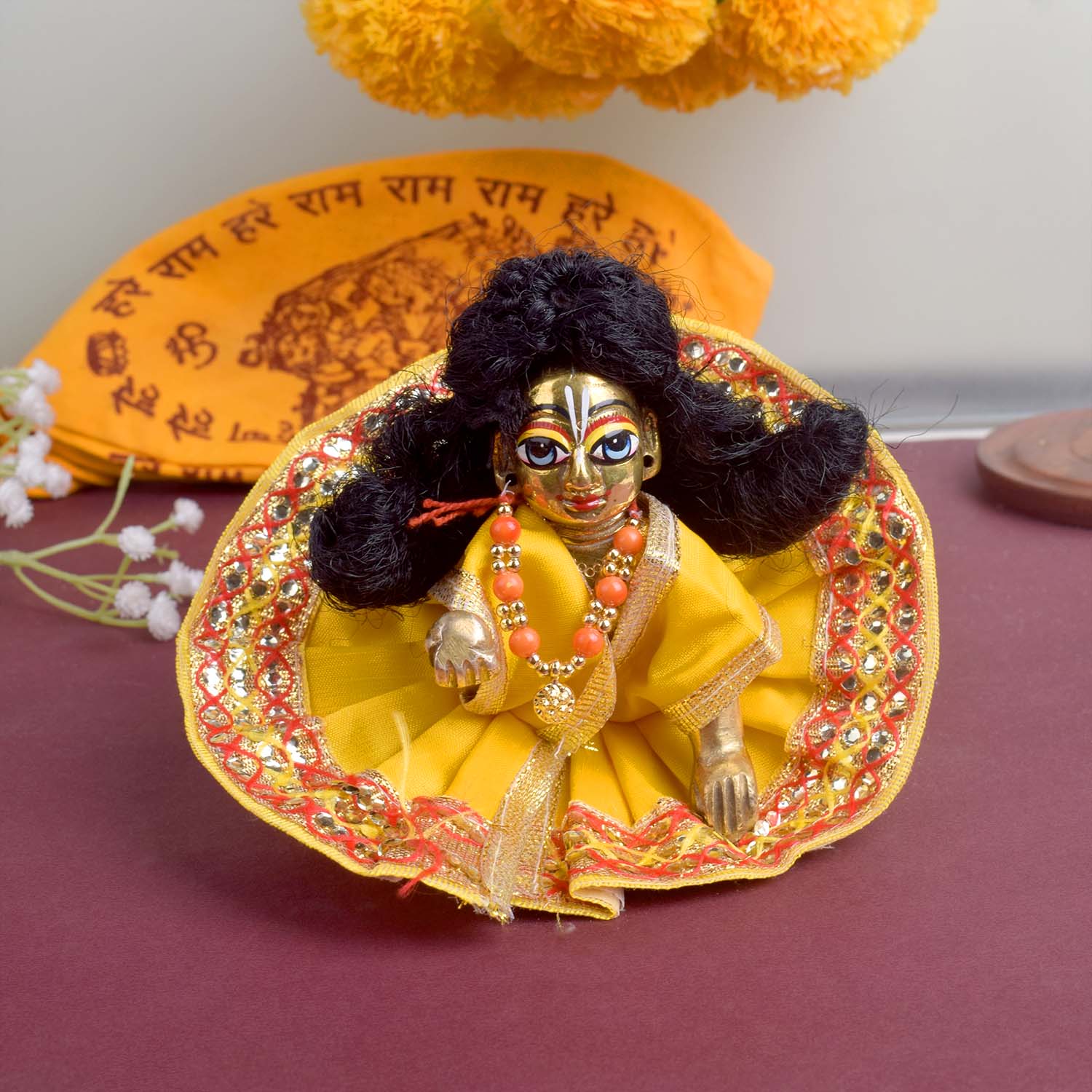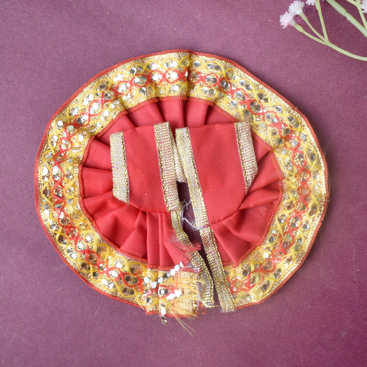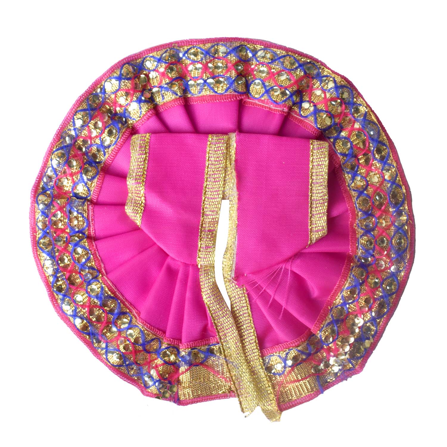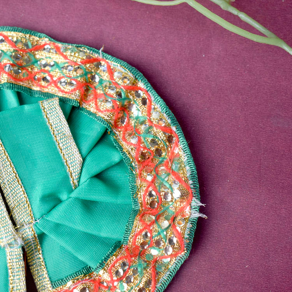 Available in blue, green, pink, orange, yellow, and red, and crafted to fit Laddu Gopal idols in sizes 1 and 2, this exquisite dress effortlessly combines tradition with a festive charm, making your deity’s appearance truly divine.