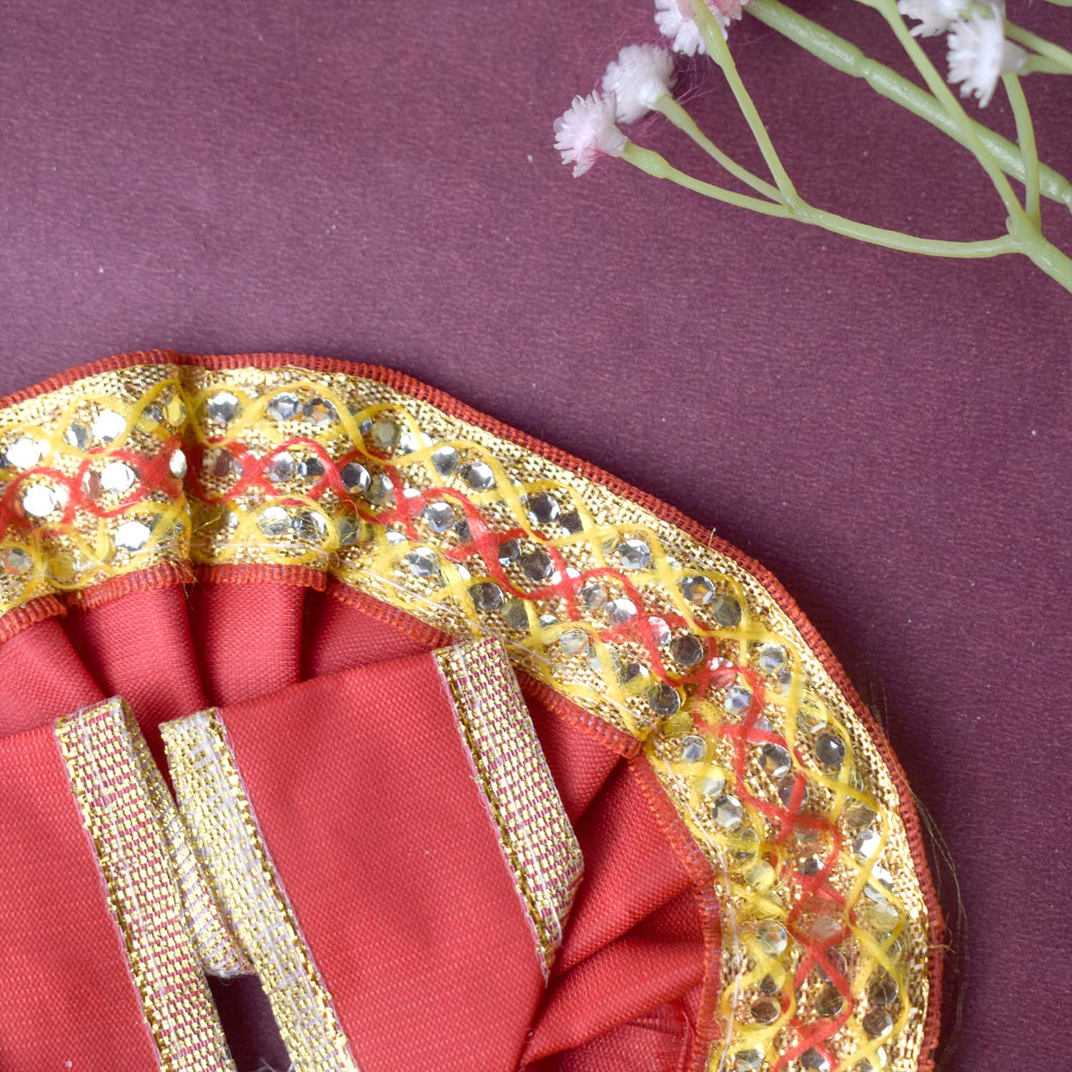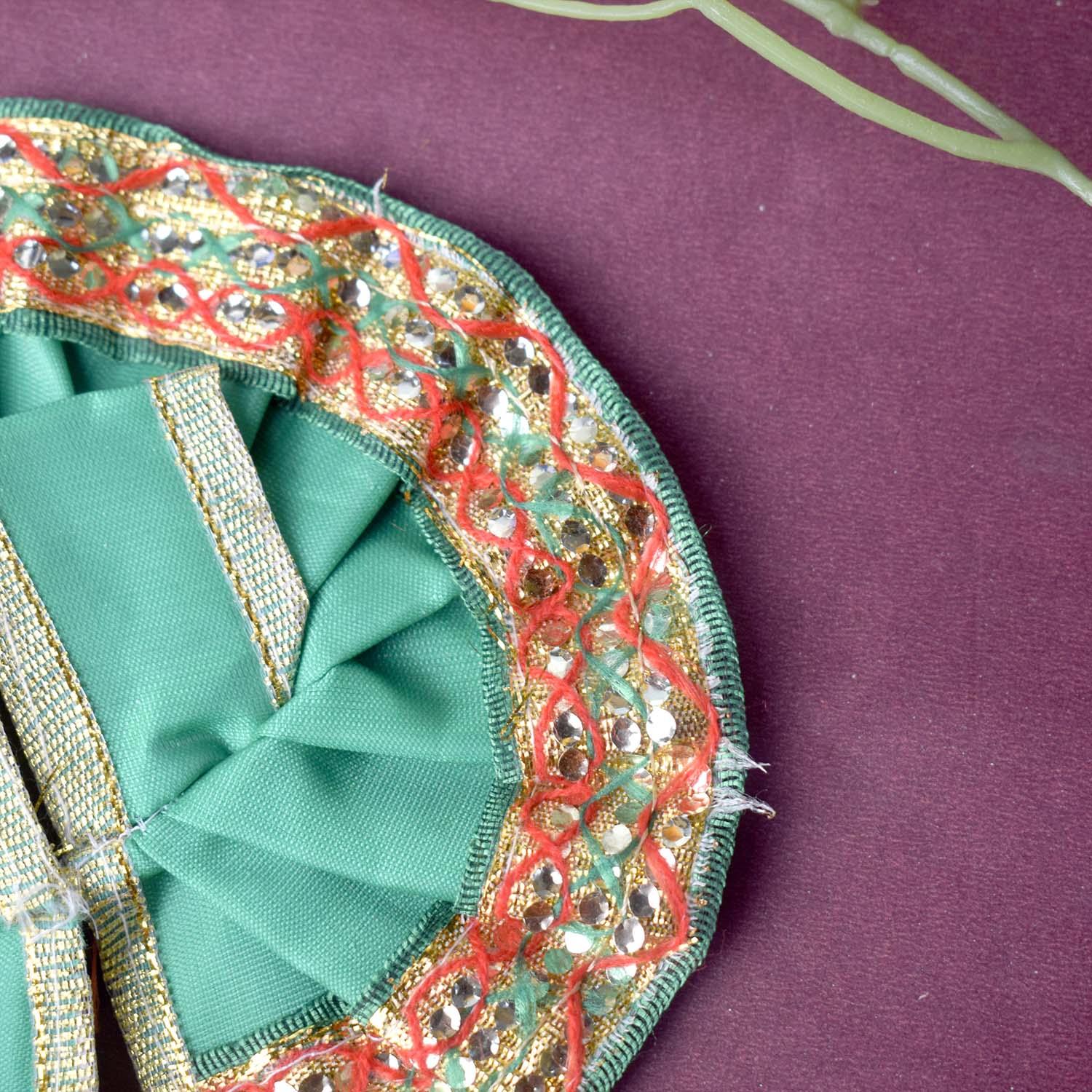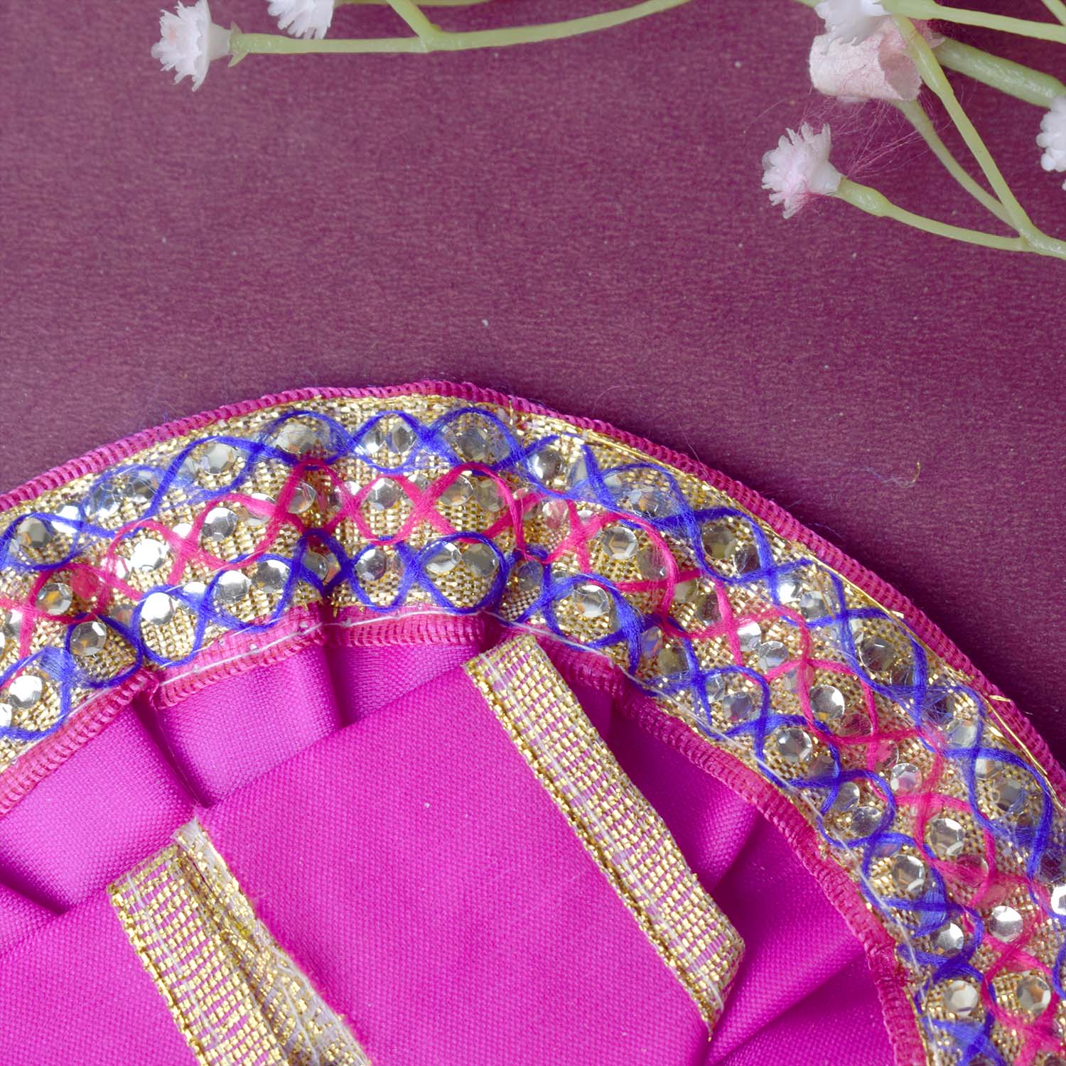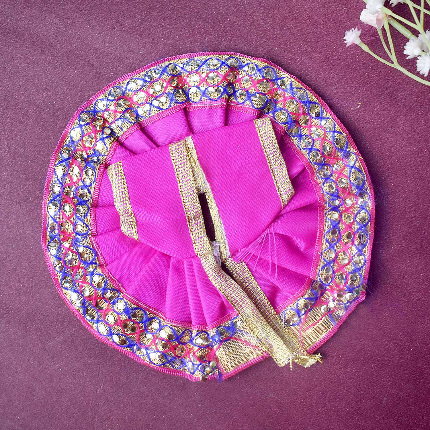 Available in blue, green, pink, orange, yellow, and red, and crafted to fit Laddu Gopal idols in sizes 1 and 2, this exquisite dress effortlessly combines tradition with a festive charm, making your deity’s appearance truly divine.